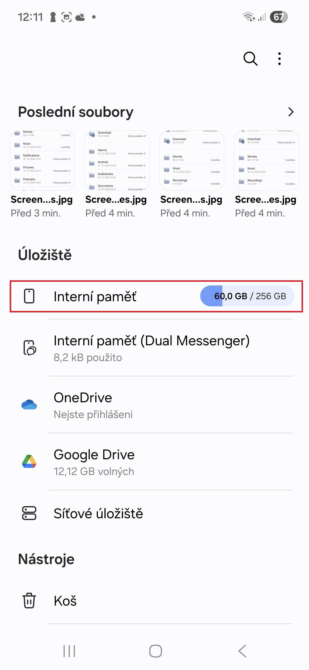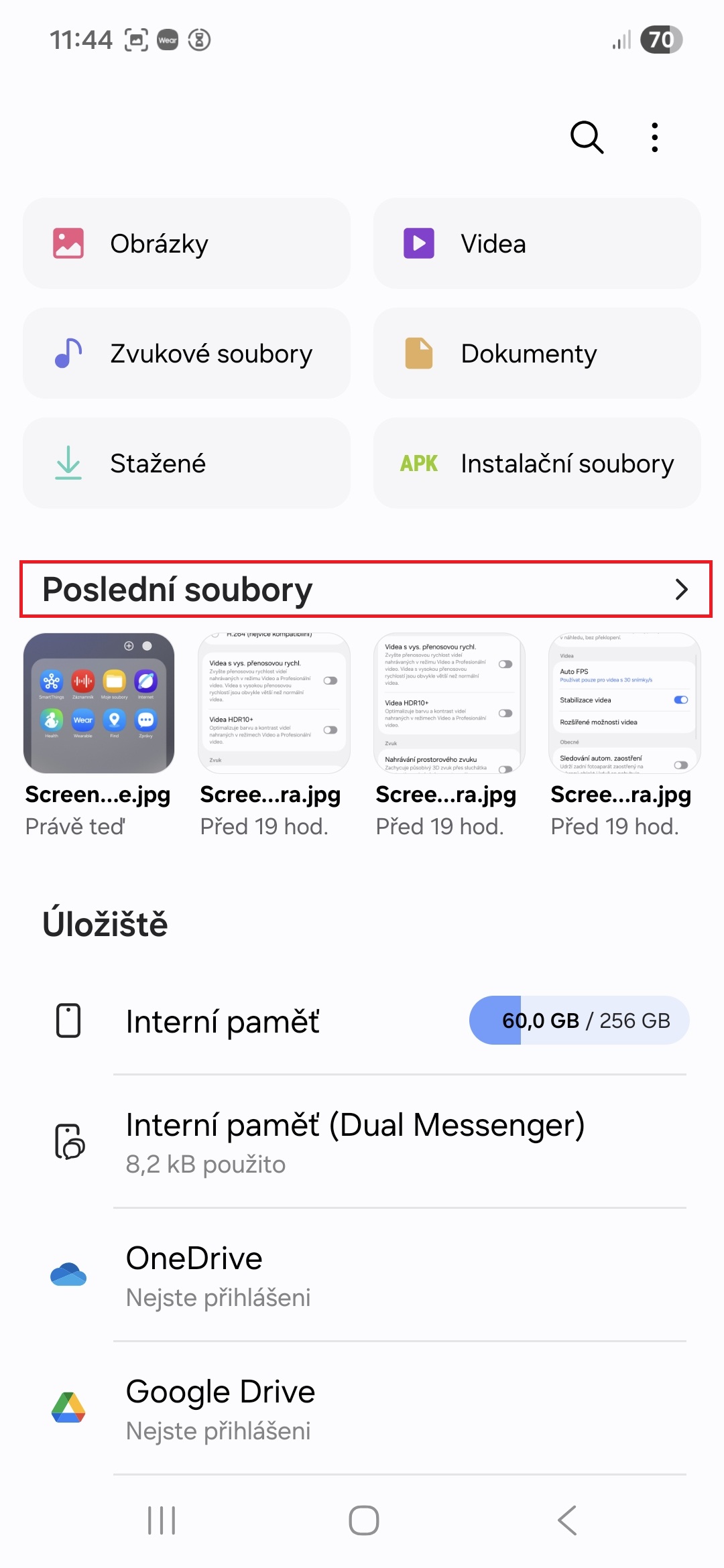 Prostřednictvím aplikace Moje soubory můžete také přistupovat k souborům uloženým na vašem cloudovém úložišti, ať už je to Disk Google, nebo OneDrive, a spravovat je zde. Stačí jen klepnout na příslušnou možnost pod položkou Interní paměť (samozřejmě je nutné být přihlášen k příslušnému účtu).