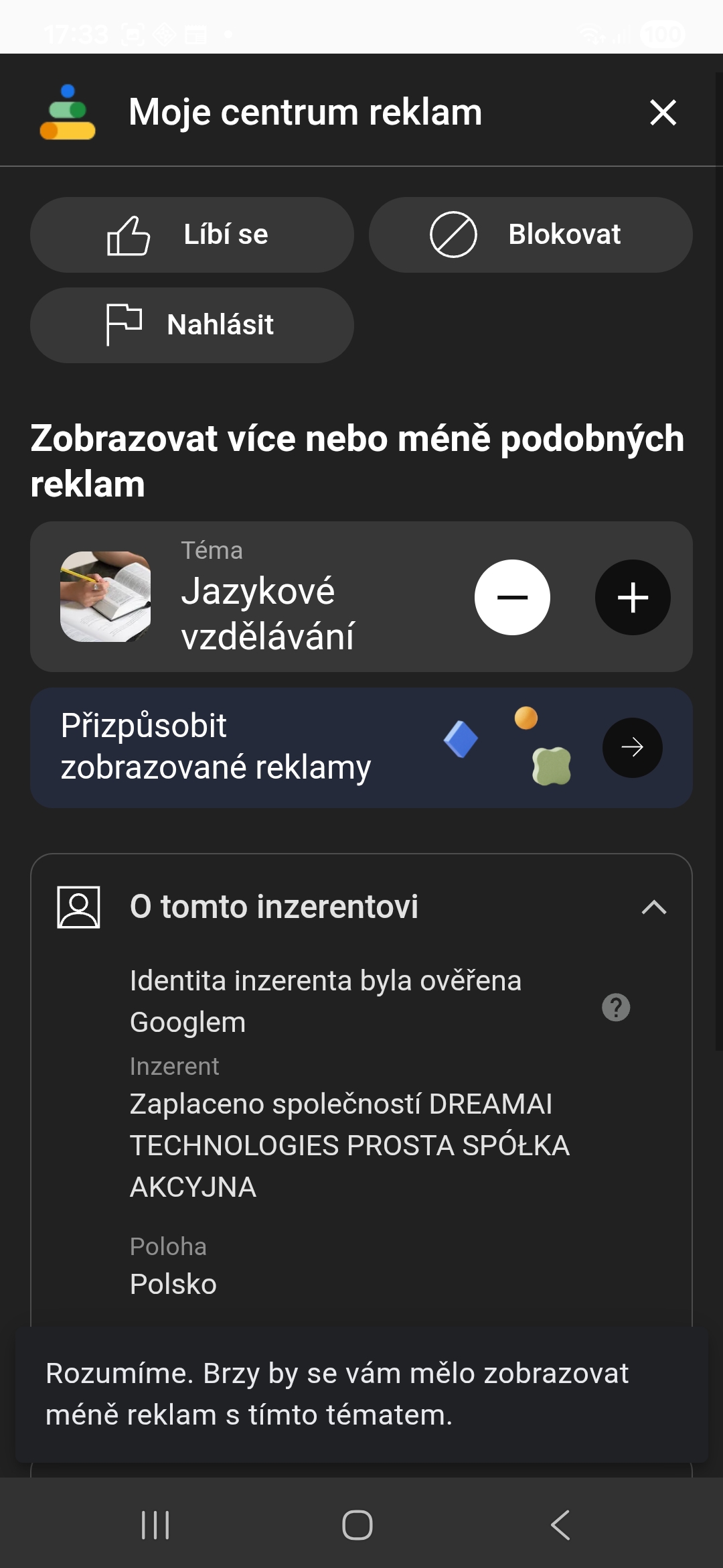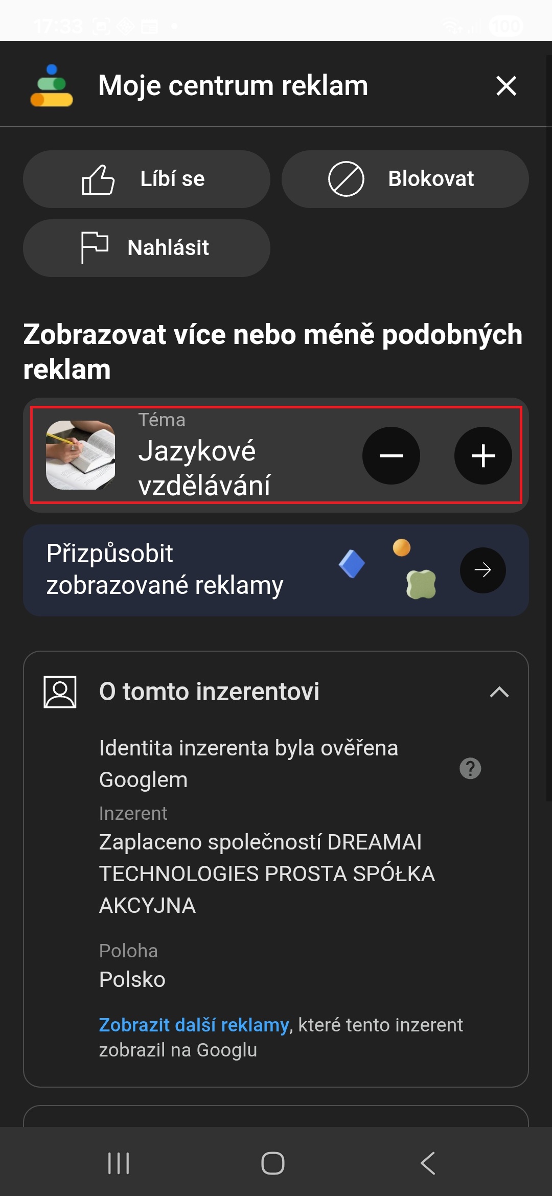 Pokud používáte YouTube bezplatně, můžete ovlivnit, jestli se určitý druh reklam bude zobrazovat méně, či více. Jednoduše u vybrané reklamy klepněte na ikonu tří teček a poté na ikonu minus, pokud chcete dostávat podobných reklam méně, nebo na ikonu plus, pokud jich chcete dostávat více.