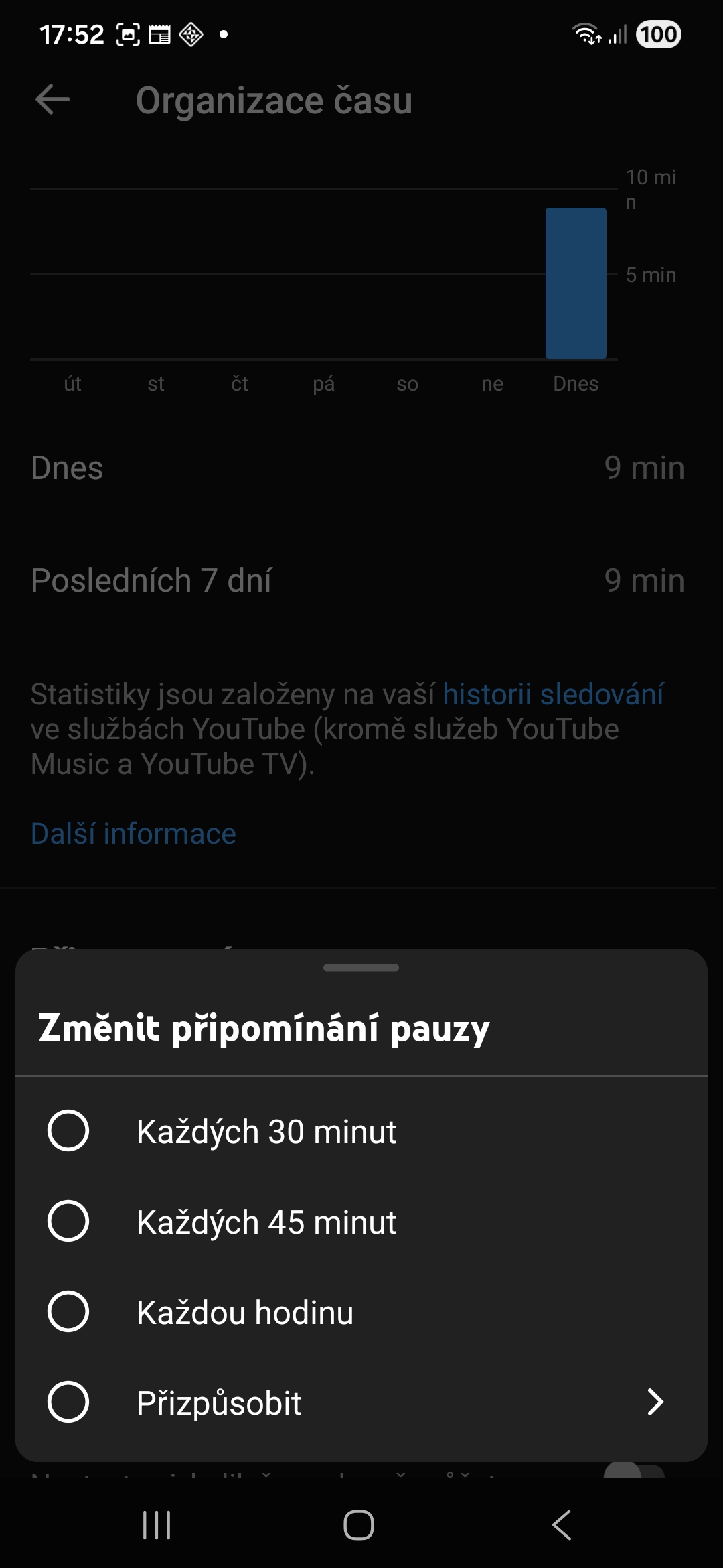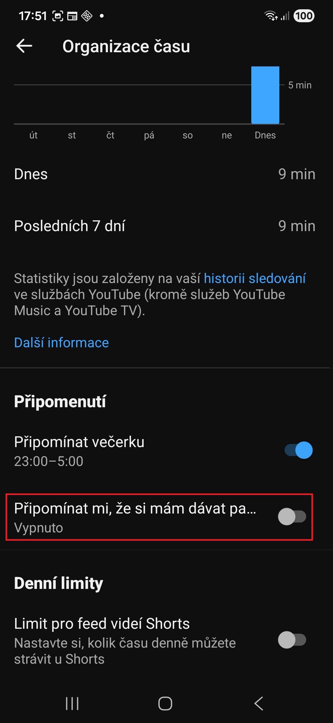 Sledování videí může být návykové, takže je dobré si čas od času dát pauzu. YouTube má funkci pauzy přímo zabudovanou – stačí přejít do Nastavení→Organizace času a v rámci možnosti Připomínat mi, že si mám dávat pauzu si nastavit, po jak dlouhé době vás má aplikace na pauzu upozorňovat. Na výběr je každých 30 minut, každých 45 minut, každou hodinu nebo si frekvenci upozornění můžete přizpůsobit dle libosti. Na stejné stránce se také můžete podívat, jak dlouho jste s YouTube strávili za posledních 7 dní.
