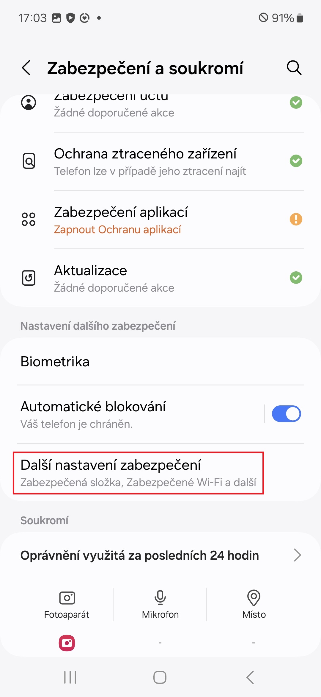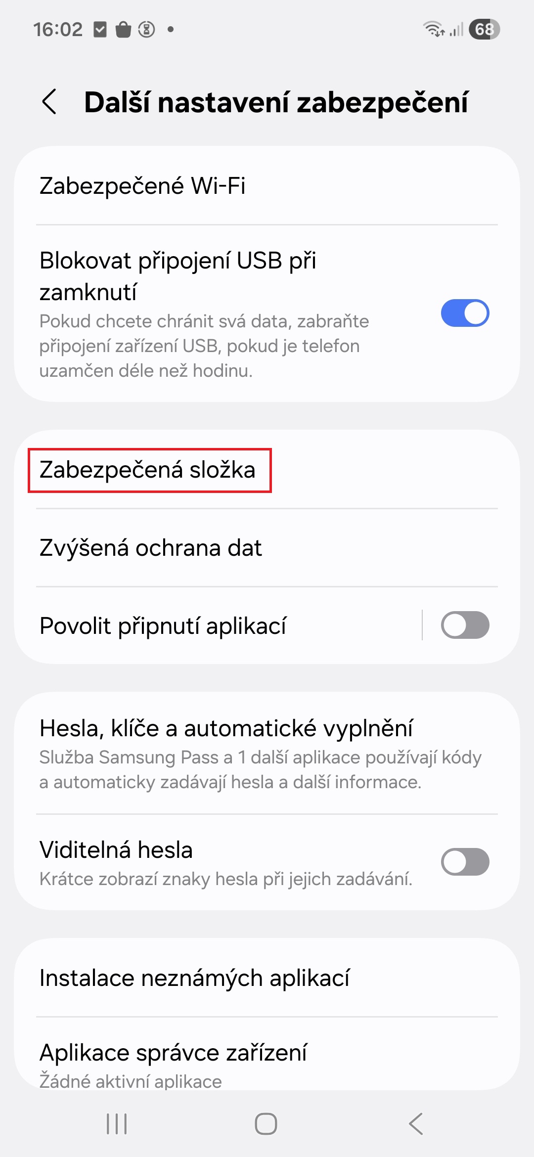 • Otevřete Zabezpečenou složku (z Nastavení→Zabezpečení a soukromí→Další nastavení zabezpečení nebo šuplíku aplikací) a zadejte nesprávné heslo.