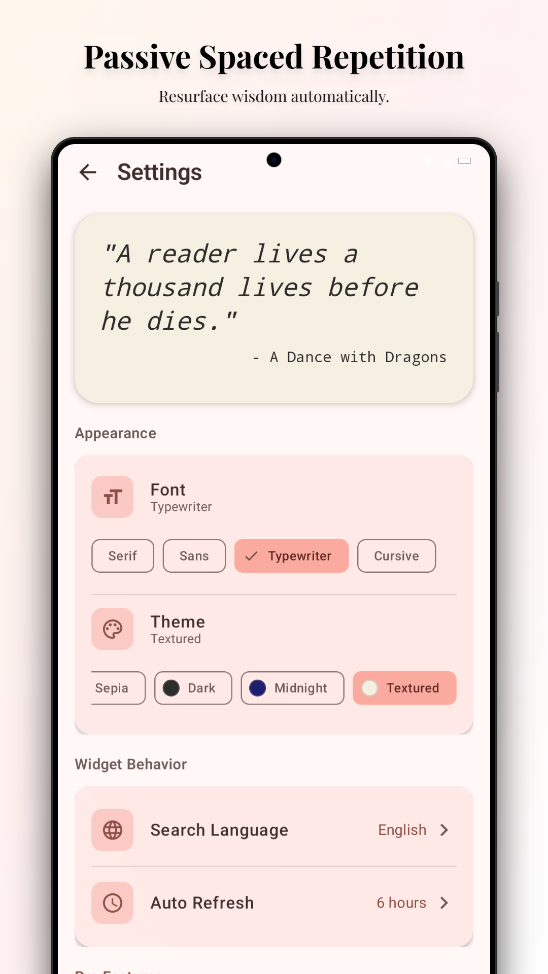 Pro milovníky literatury je tu DogEar, elegantní widget, který na vaši domovskou či uzamčenou obrazovku v pravidelných intervalech promítá citáty z vašich oblíbených knih. Aplikace slouží i jako prohlížeč památných momentů z populárních románů. Je k dispozici zdarma, ovšem pro plný přístup k rozsáhlejší knihovně a pokročilým funkcím je vyžadováno předplatné.