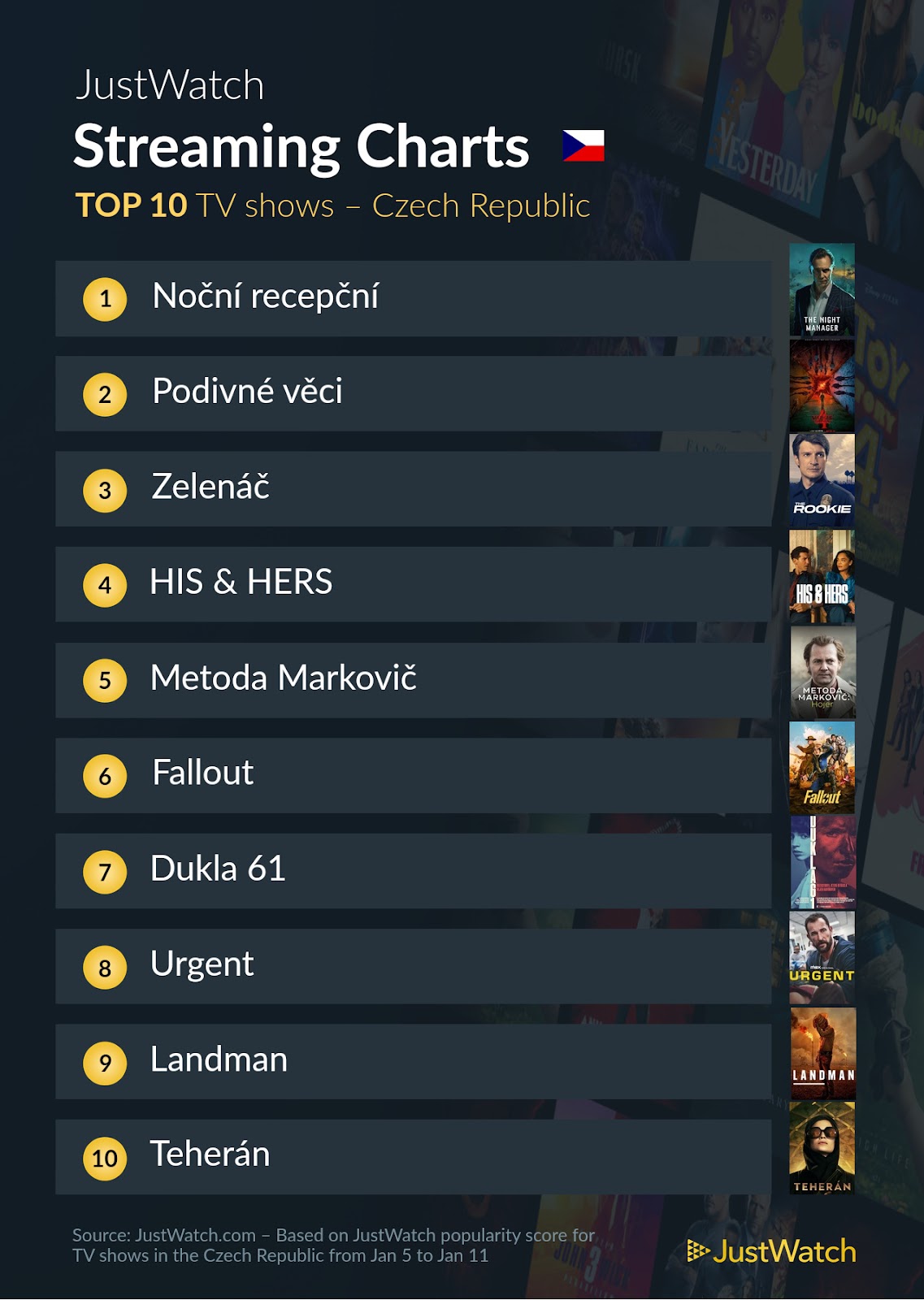 V seriálech vyhrál Noční recepční a jak bylo řečeno, k dispozici je v Prime Video. Dvojkou byly Stranger Things ze sítě Netflix a trojkou Zelenáč, který je k dispozici jak na Netflixu tak v Disney+. Na 5. pozici se objevila Metoda Markovič, která na Oneplay již odvysílala první díl druhé série, který se věnuje spartakiádnímu vrahu Strakovi. Žebříček byl tvořen na základě zájmu uživatelů platformy JustWatch od 5. do 11. ledna 2026.