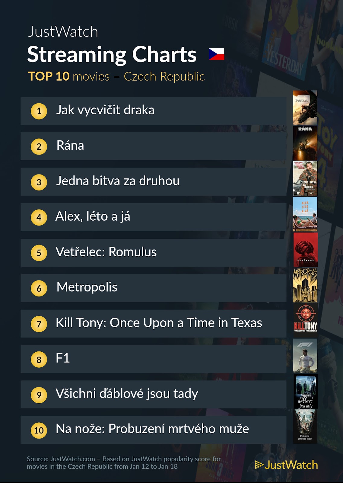 Jedničkou mezi filmy uplynulého týdne je, jak ostatně můžeme osobně potvrdit, velice příjemná, milá a rodinná podívaná v podobě Jak vycvičit draka. Jedná se o hraný remake původního animovaného filmu studia DreamWorks z roku 2010. K dispozici je ve SkyShowtime. Netflix s hvězdně obsazeným novinkovým snímkem vlastní produkce Rána obsadil až druhou pozici. Třetí je vítěz Golden Globes 2026 Jedna bitva za druhou, která je třetí. Vidět ji můžete v HBO Max.