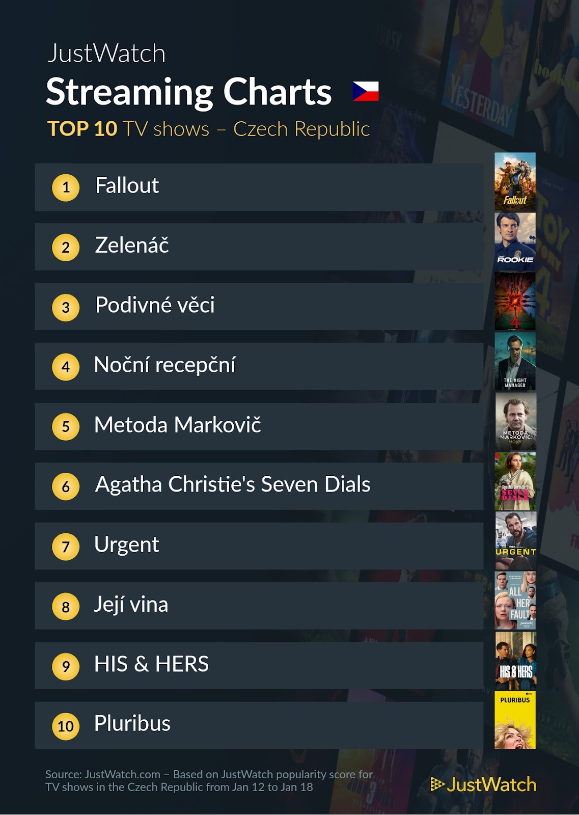 Ani seriály Netflix neopanoval, protože ho v nich předběhlo Prime Video a jeho hit Fallout. Zelenáč je navíc k dispozici nejen na síti Netflix ale také Disney+, takže má pozici jednodušší. Třetí byly Stranger Things, tedy už plnohodnotný vlastní Netflix titul. Žebříček byl tvořen na základě zájmu uživatelů platformy JustWatch od 12. do 18. ledna 2026.
