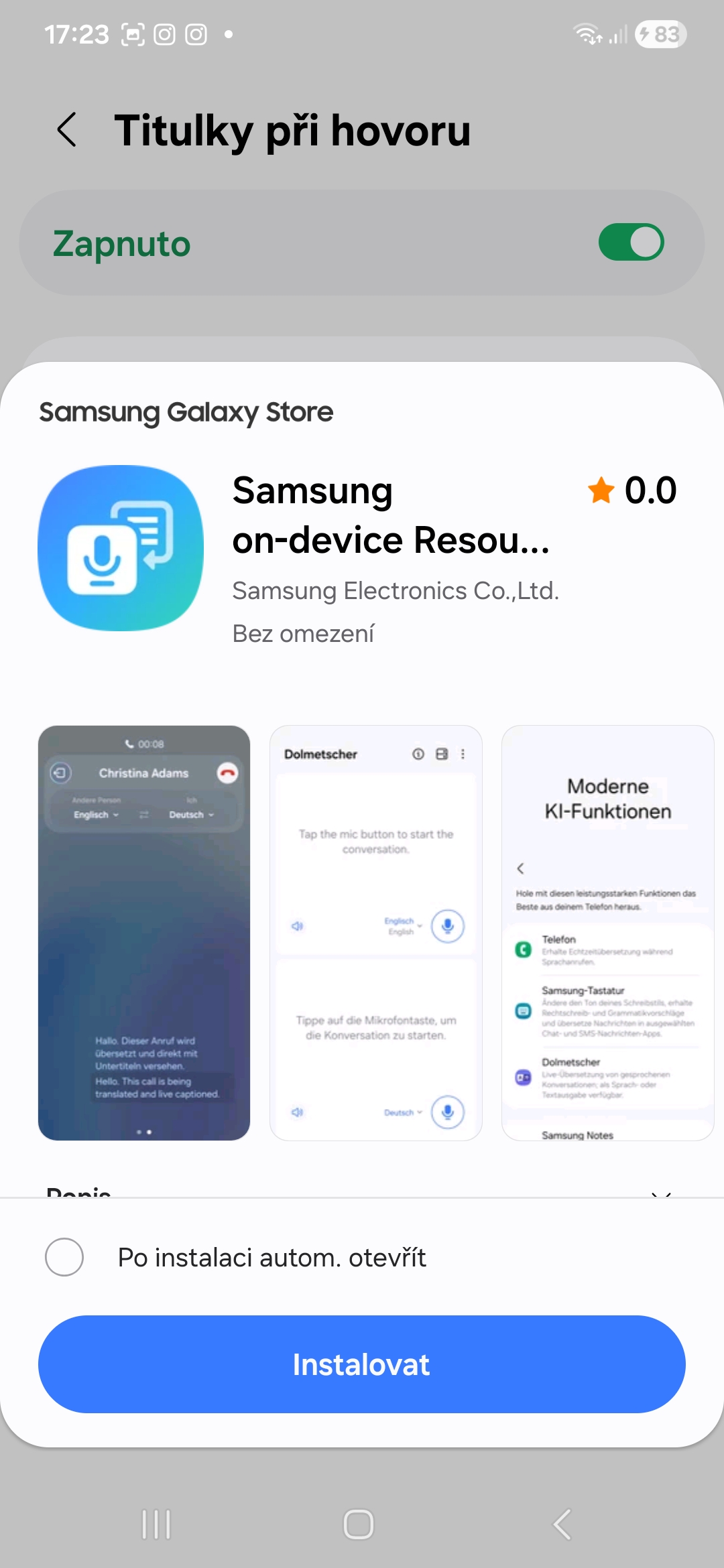 - Klepněte na tlačítko Instalovat, abyste nainstalovali aplikaci Samsung on-device Resource, která obsahuje příslušnou jazykovou sadu.