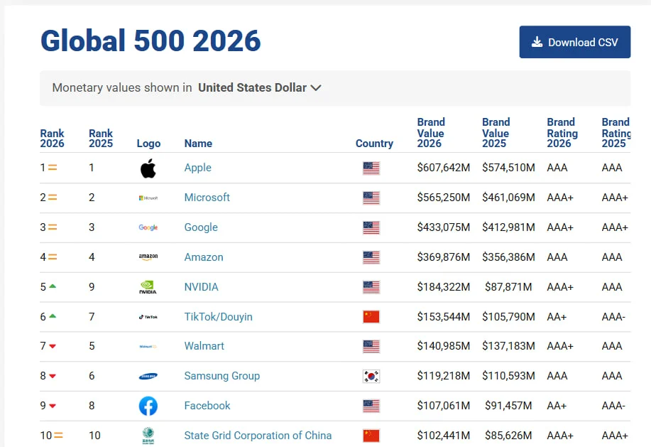 Třetí příčku už potřetí obsadil Google se 433,1 miliardami dolarů, u něhož jde o 5% nárůst hodnoty z loňských 413 miliard dolarů. A bramborovou medaili získal Amazon s 369,8 miliardami dolarů, který meziročně vzrostl o 4 % (z loňských 356,4 miliard dolarů). Pátou příčku obsadila Nvidia, na šestém místě je TikTok.