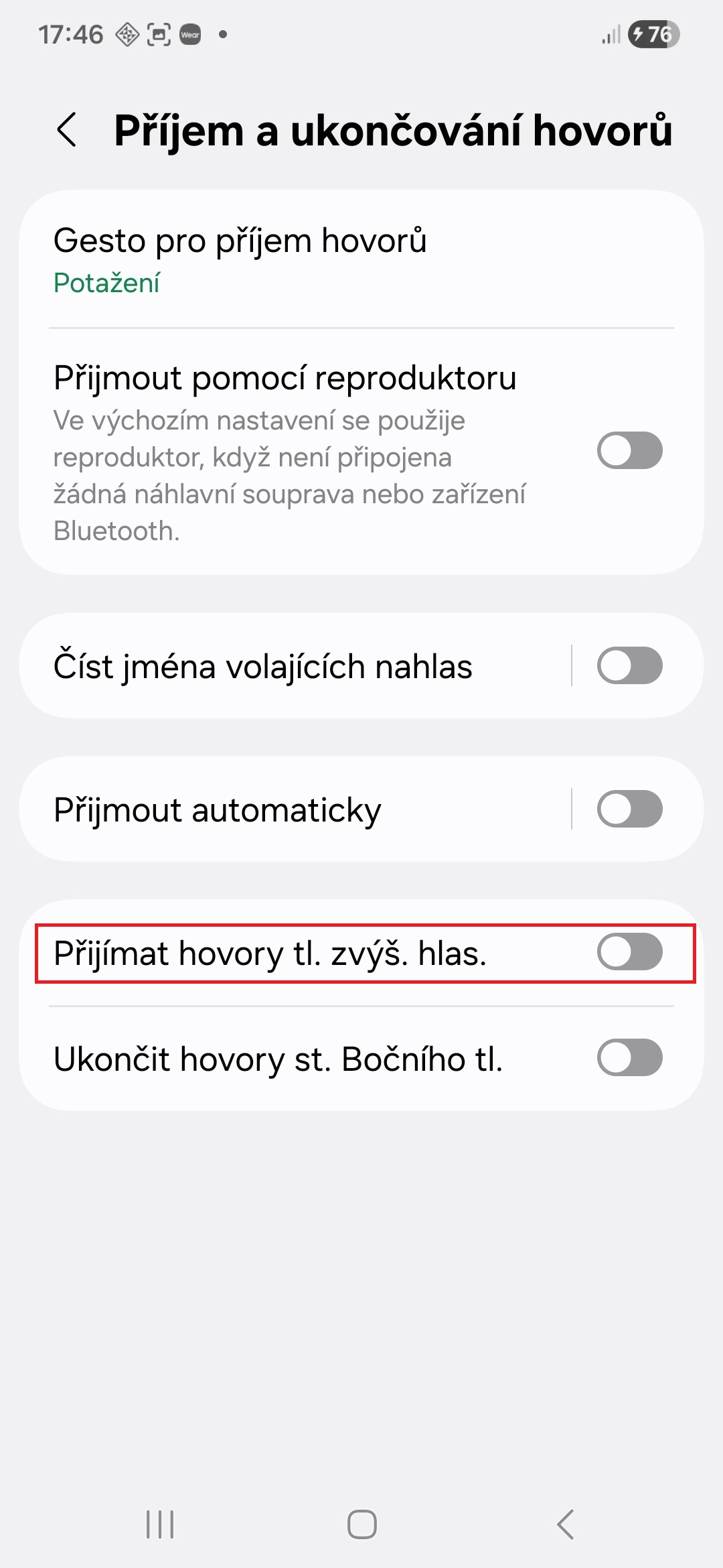 - Zapněte přepínač Přijímat hovory tl. zvyš. hlas.