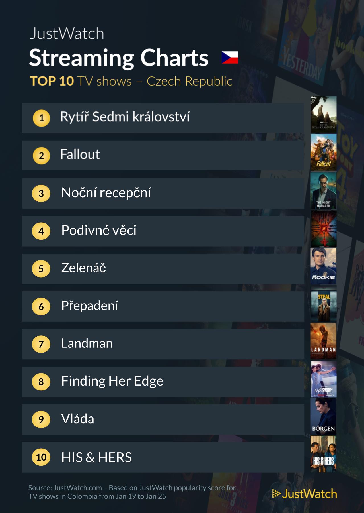 Není překvapením, že nejpopulárnějším seriálem minulého týdne je Rytíř sedmi království, čili nový příběh ze světa Hry o trůny. Vidět jej můžete v HBO Max (zatím ale jen dva díly). Dvojkou byl Fallout a trojkou Noční recepční, oba tituly jsou k dispozici v Prime Video. Žebříček byl tvořen na základě zájmu uživatelů platformy JustWatch od 19. do 25. ledna 2026.