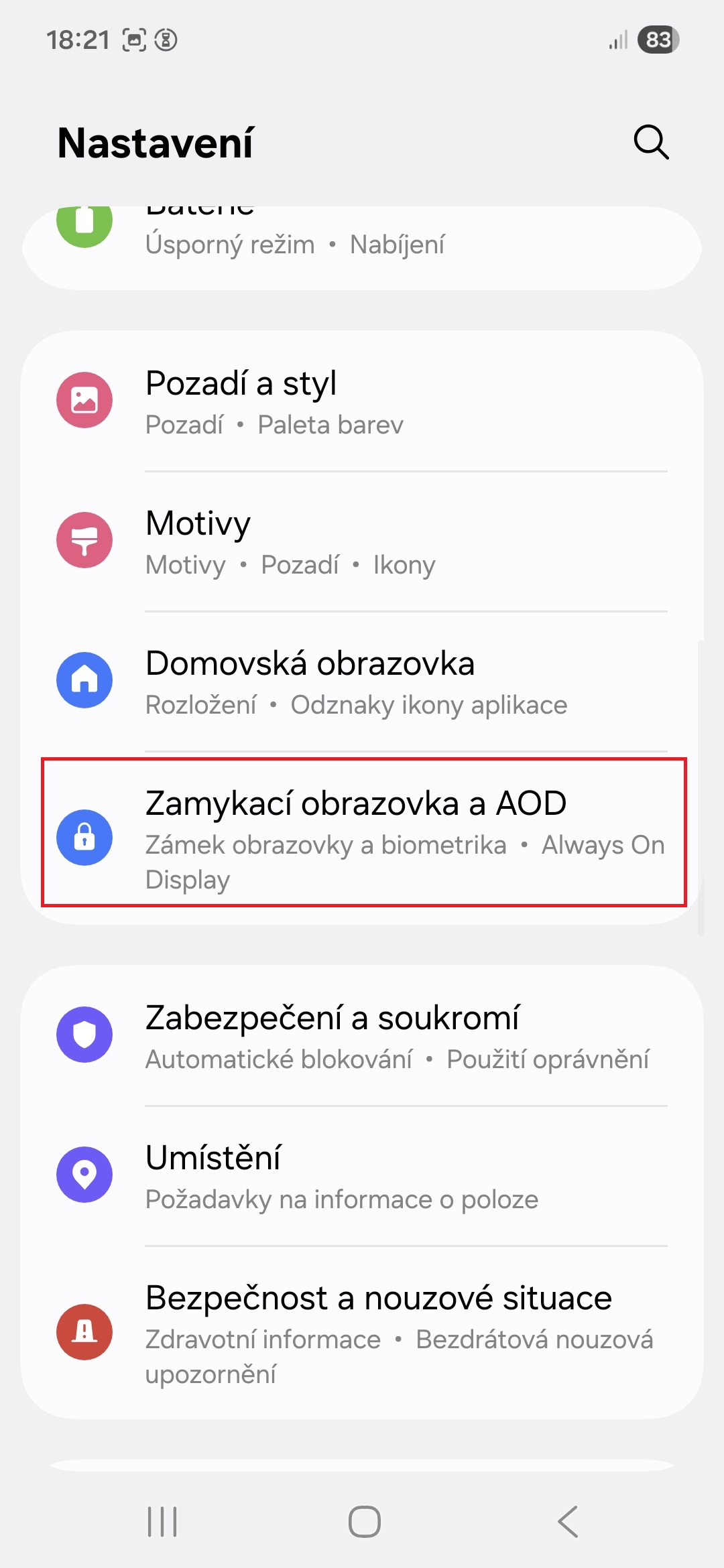 - Vyberte nabídku Zamykací obrazovka a AOD.