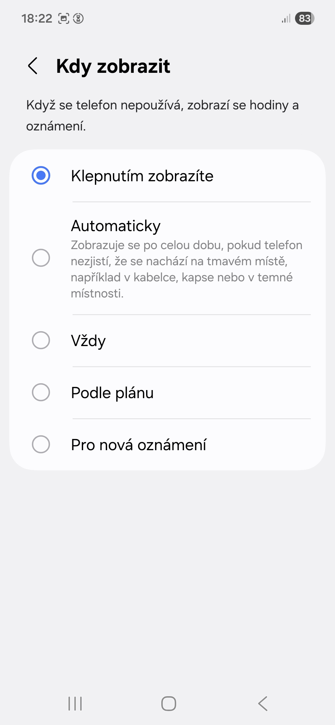 Jak jistě víte, ve výchozím nastavení AOD aktivujete poklepáním na obrazovku. Možná již ale nevíte, že k dispozici máte i možnosti Automaticky (AOD se zobrazuje po celou dobu, pokud telefon nezjistí, že se nachází na tmavém místě, jako je kapsa či temná místnost), Vždy, Podle plánu (vyberete si, odkdy dokdy má být AOD zapnutý) a Pro nová oznámení (AOD se zapne, jen když dorazí nová notifikace). Je třeba upozornit, že možnosti Automaticky a Vždy spotřebovávají o něco více energie baterie, nicméně dnešní OLED displeje jsou již tak energeticky úsporné, že to možná ani nepocítíte. AOD si každopádně na svém telefonu Galaxy přizpůsobíte takto:
