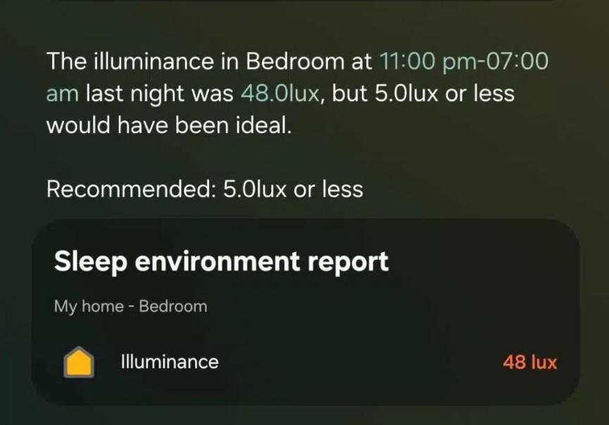 Užitečnou vychytávkou jsou také zprávy o prostředí spánku. Tato funkce používá zařízení propojená s aplikací SmartThings, aby vám ukázala, jak osvětlený byl váš pokoj, když jste spali. Můžete k tomu použít specializovaný světelný senzor nebo většinu televizorů a chytrých monitorů Samsung.