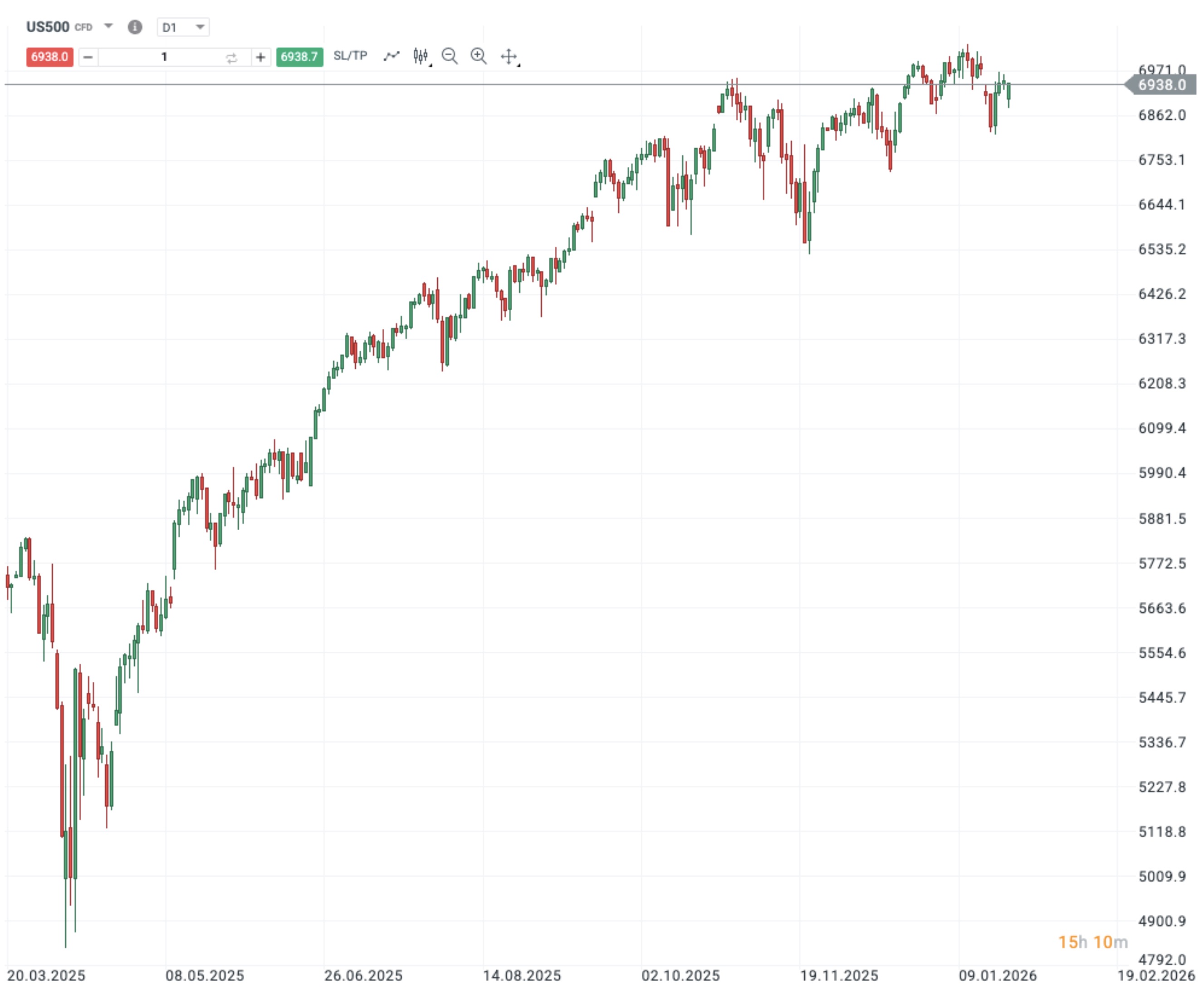 Vývoj ceny indexu S&P 500. Zdroj: Investiční aplikace XTB. Minulé výsledky nejsou spolehlivým ukazatelem budoucích výsledků.