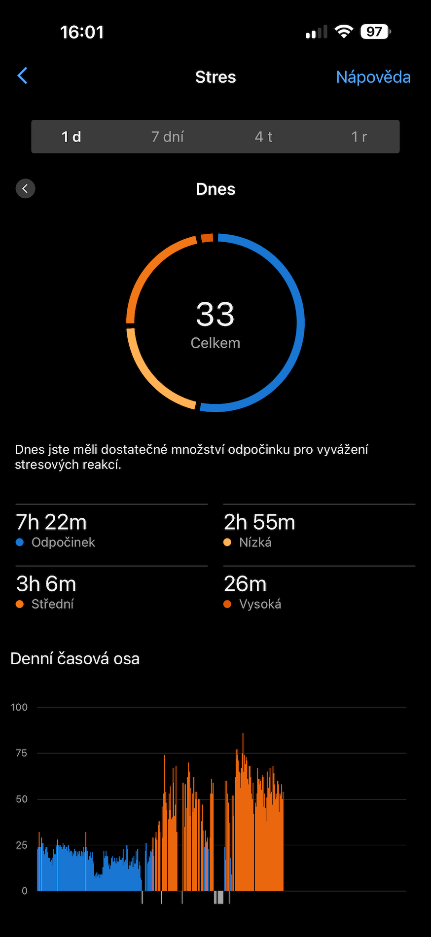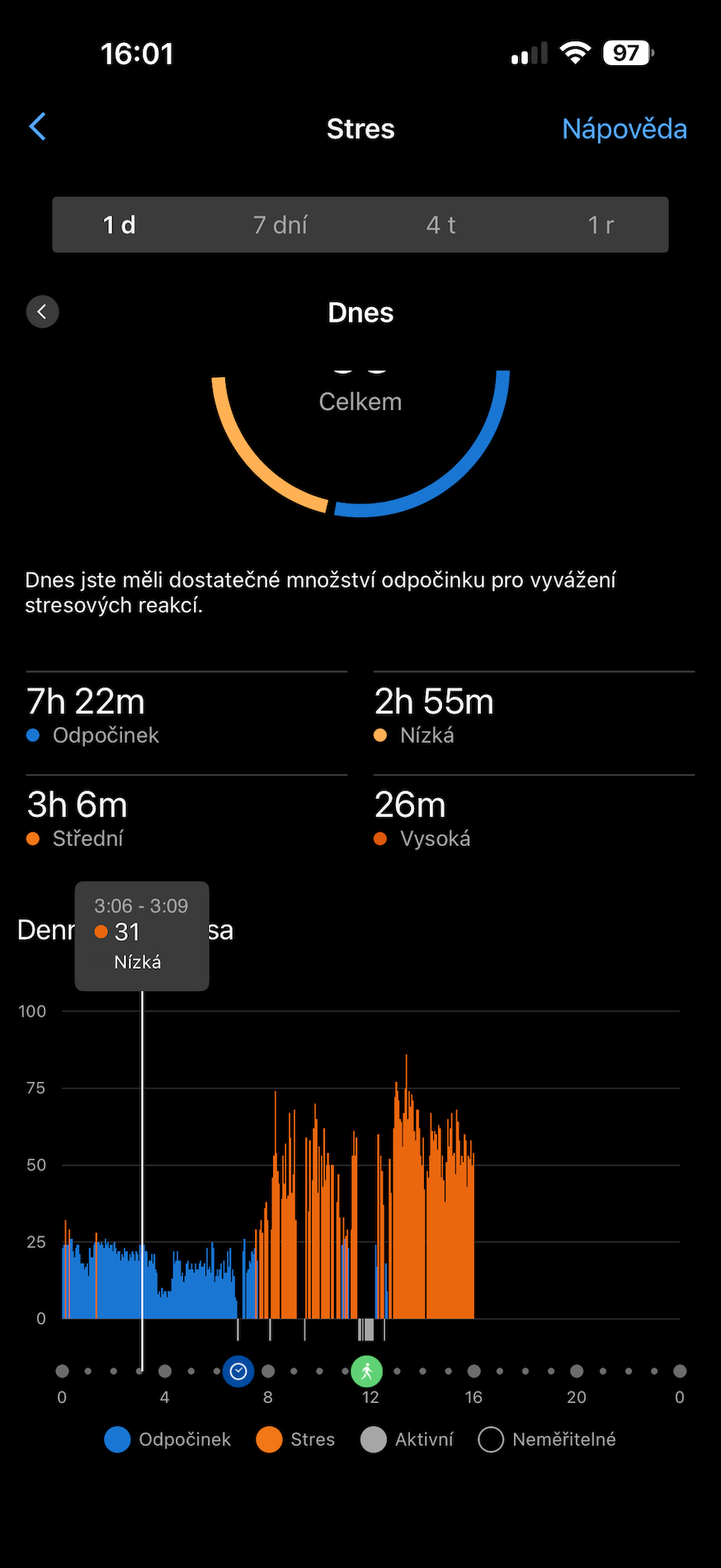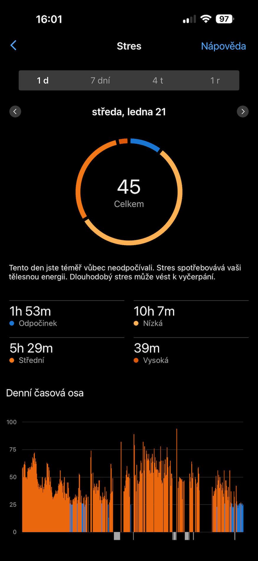 Tohle byl pro mě největší „aha“ moment. Hodinky neměří stres jen jako psychické vypětí, ale jako reakci nervového systému. Pokud v noci vidím v grafu oranžové sloupce místo klidných modrých, vím přesně, kde je problém. Obvykle za to může sklenička nějakého alkoholického nápoje před spaním, těžké jídlo nebo začínající viróza. Je to upřímné zrcadlo mého životního stylu.