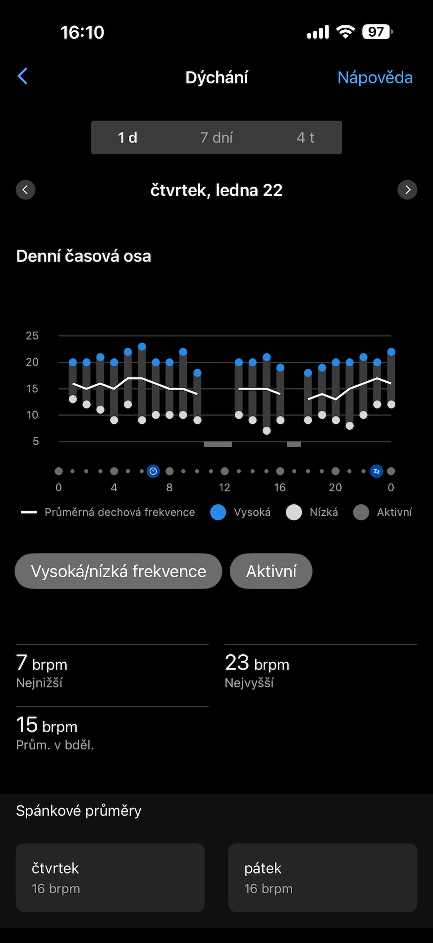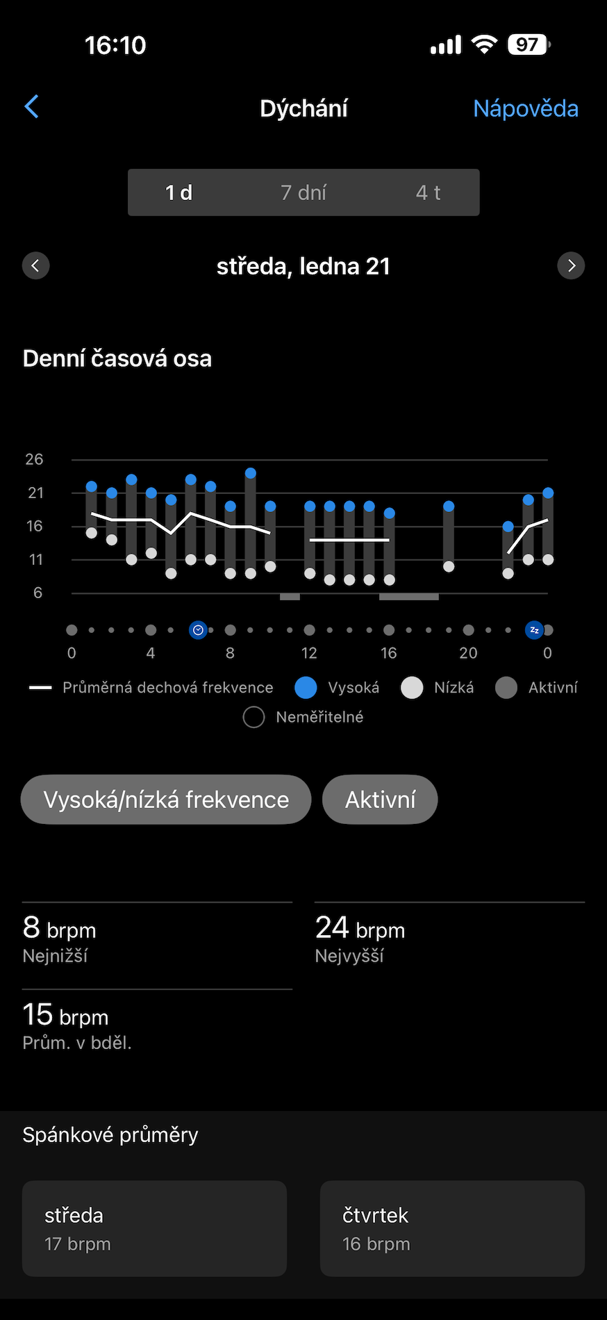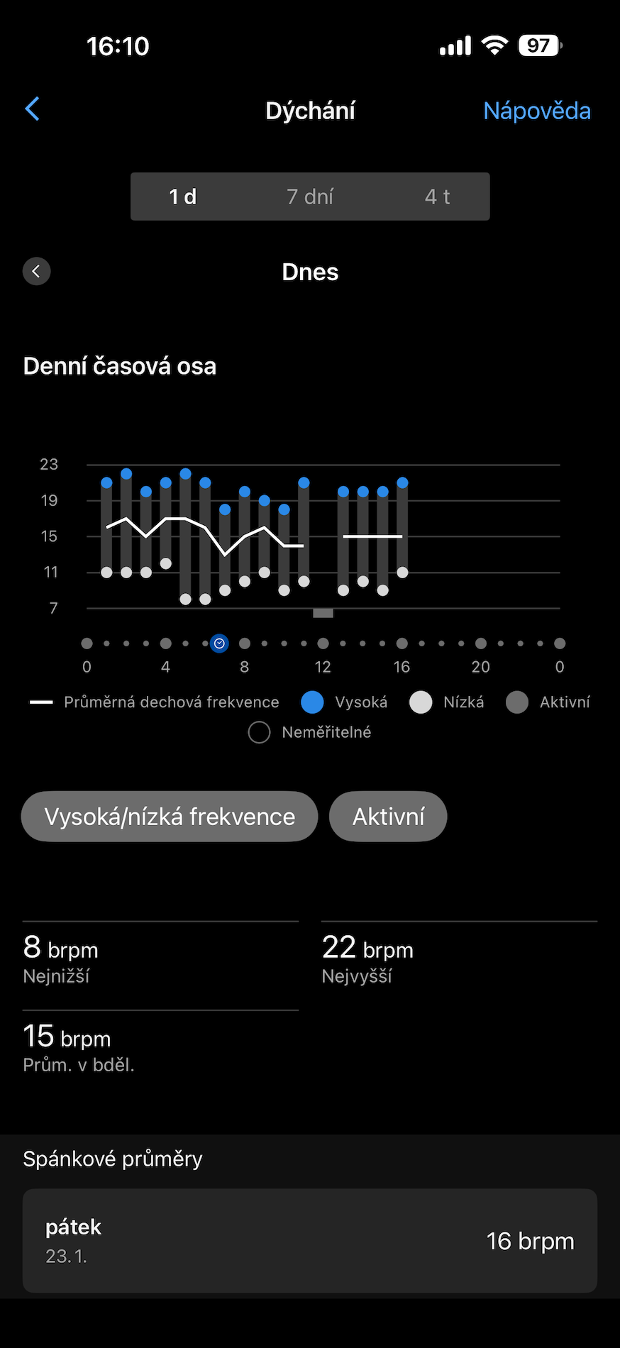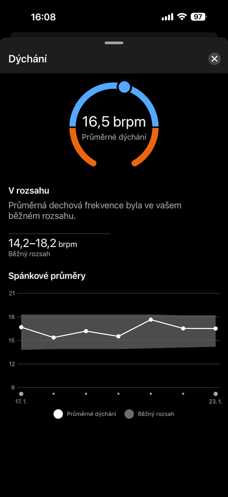 Tahle metrika je často přehlížená, ale je to skvělý včasný varovný systém. Náhlé zvýšení počtu nádechů za minutu během spánku u mě často signalizuje, že tělo bojuje s velkým fyzickým vyčerpáním nebo přicházející nemocí, a to dřív, než se objeví první příznaky.