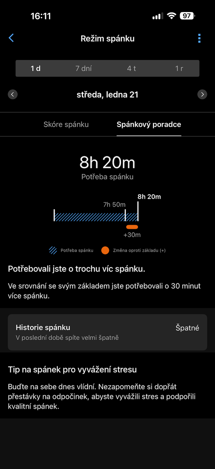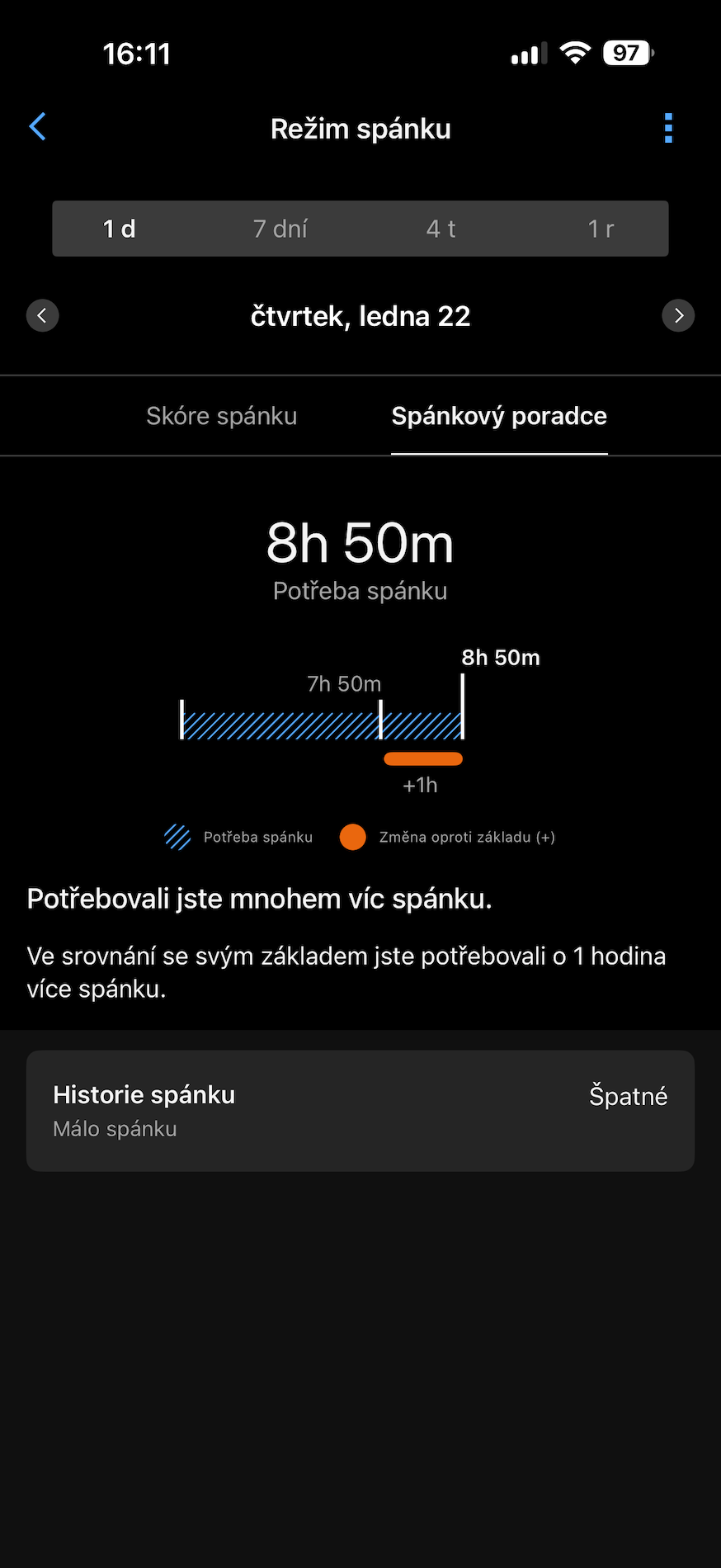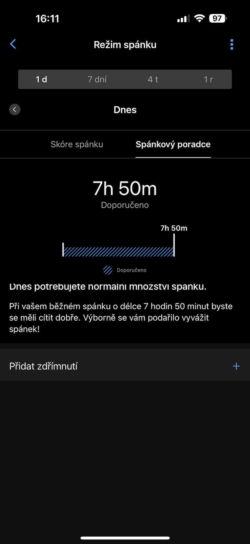 Nové modely Garminu už umí pracovat s tzv. „spánkovým dluhem“ v reálném čase. Funkce Spánkový poradce mi přesně řekne, o kolik déle bych měl spát po náročném aktivním dni, nebo mi naopak odečte potřebný čas, pokud si dám odpoledne dvacetiminutového šlofíka (kterého hodinky samy rozpoznají).