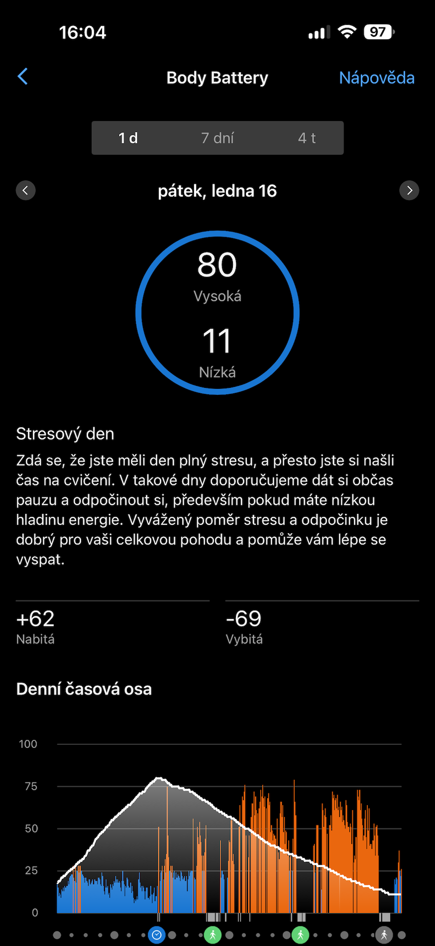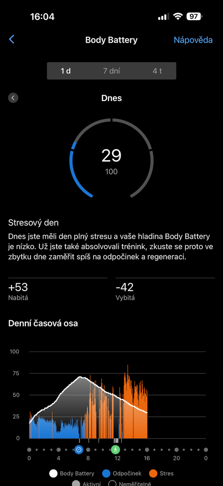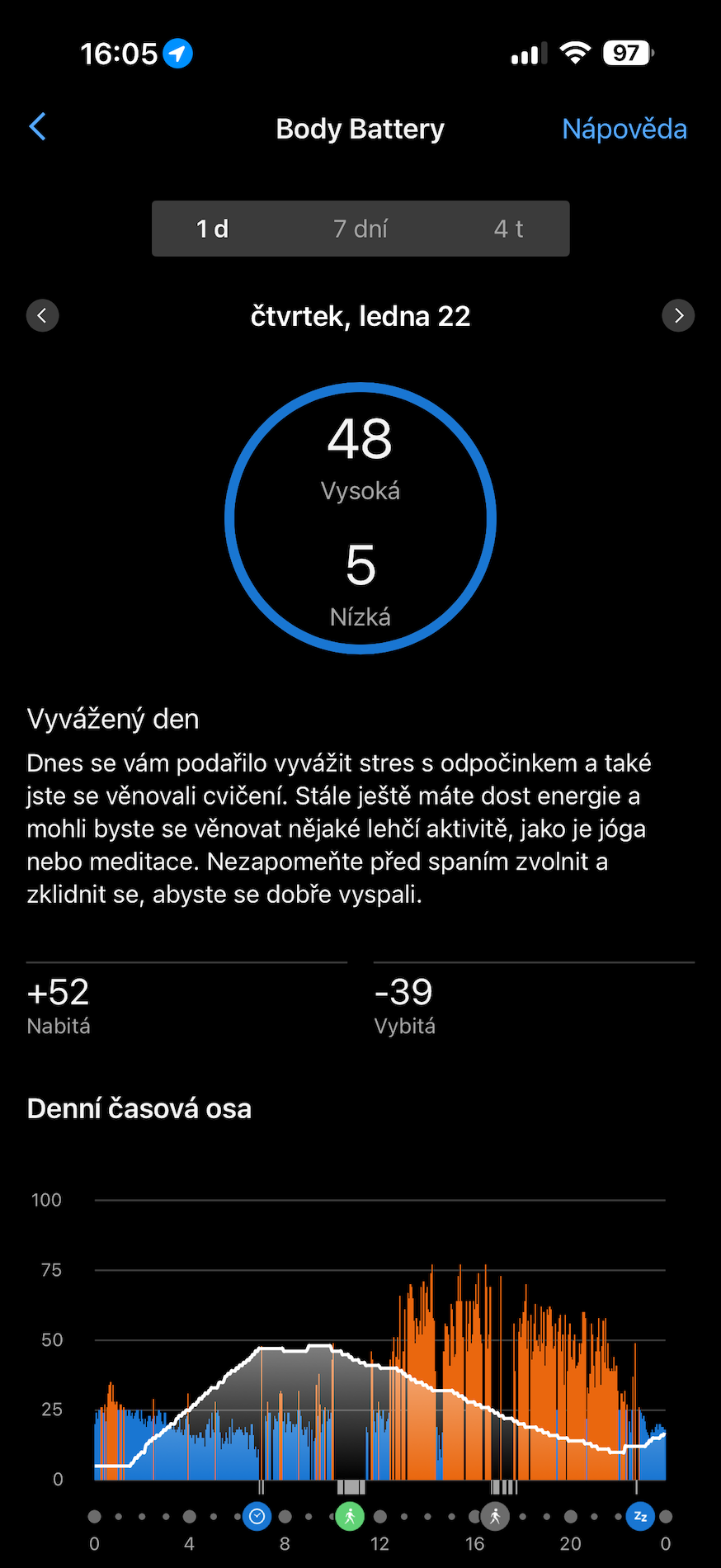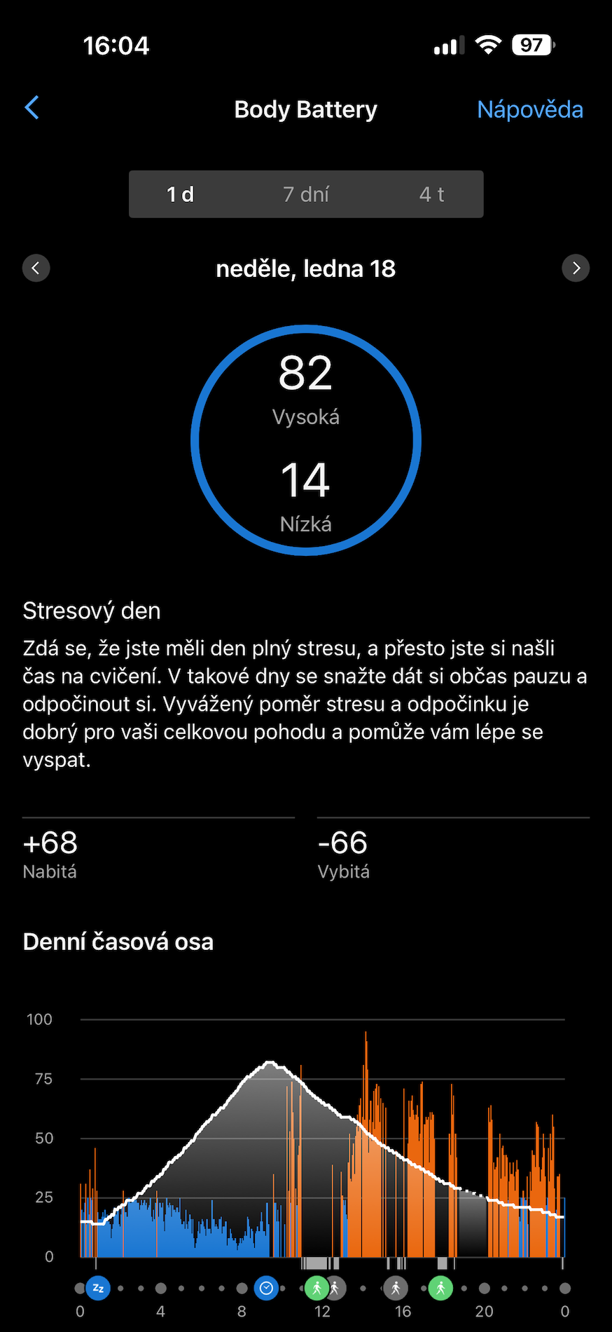 Body Battery není jen číslo, je to ukazatel toho, kolik „paliva“ mi zbývá v nádrži. Díky této hodnotě jsem se naučil lépe plánovat den. Pokud se ráno neprobudím s hodnotou blízkou alespoň 80 bodům, vím, že bych měl ubrat na intenzitě aktivit a raději zařadit klidnější režim, abych předešel totálnímu vyhoření. A body Battery se nejlépe dobíjí spánkem – pokud není kvalitní, není vysoká ani tato hodnota.