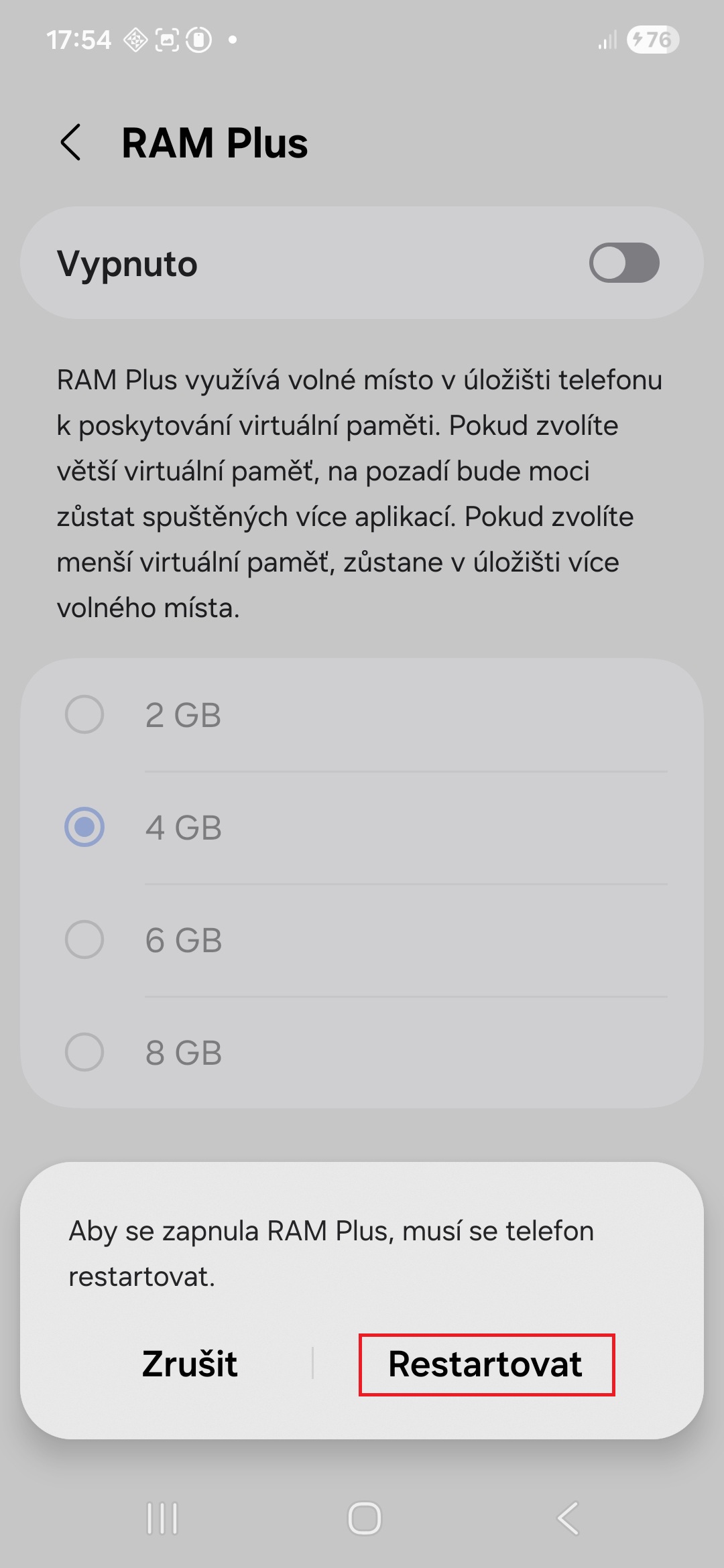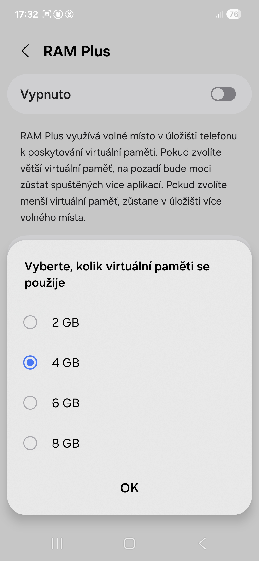 - Zapněte příslušný přepínač a vyberte, kolik virtuální paměti se má využít (ve výchozím nastavení je to 4 GB, dalšími možnostmi jsou 2, 6 a 8 GB), a potvrďte klepnutím na tlačítko OK. O to, kolik virtuální paměti zvolíte, se zmenší místo na úložišti.