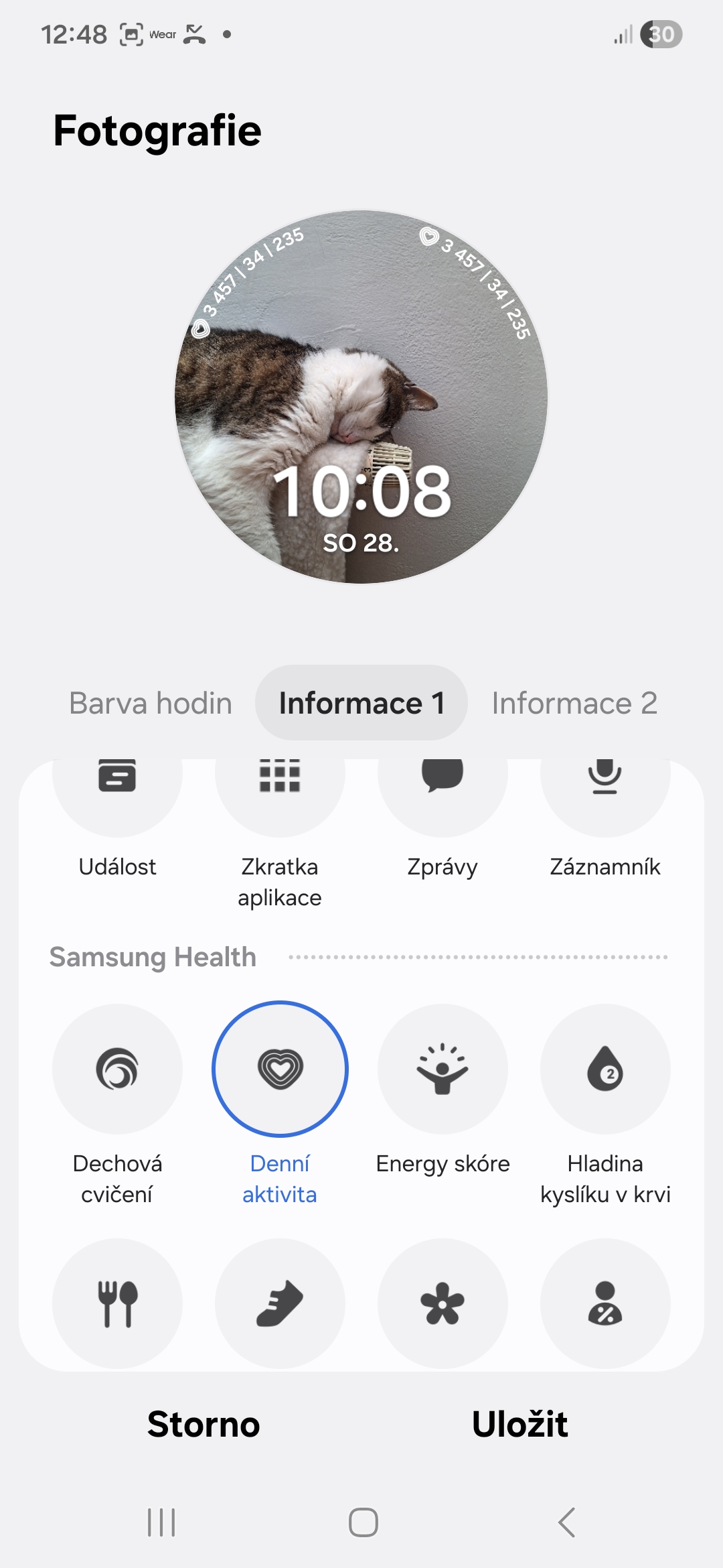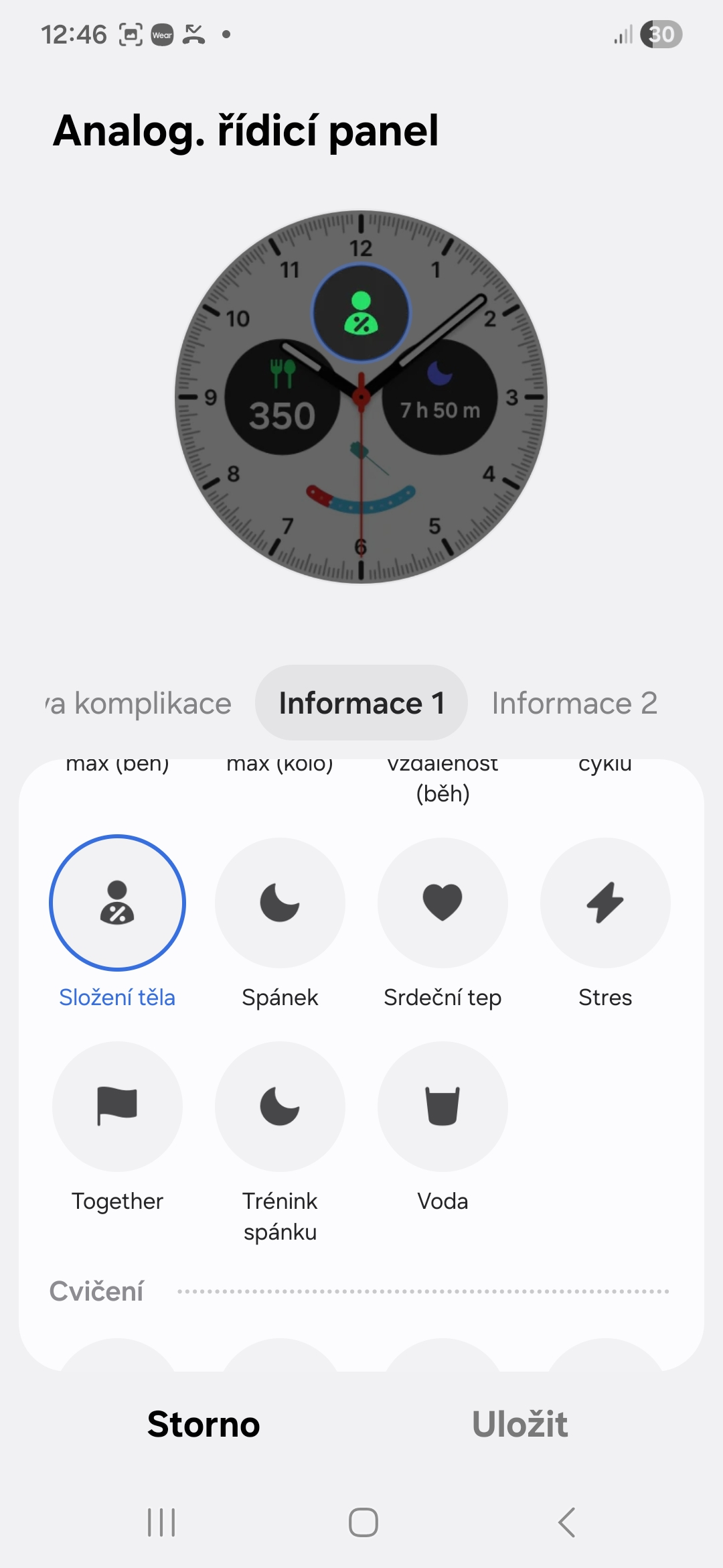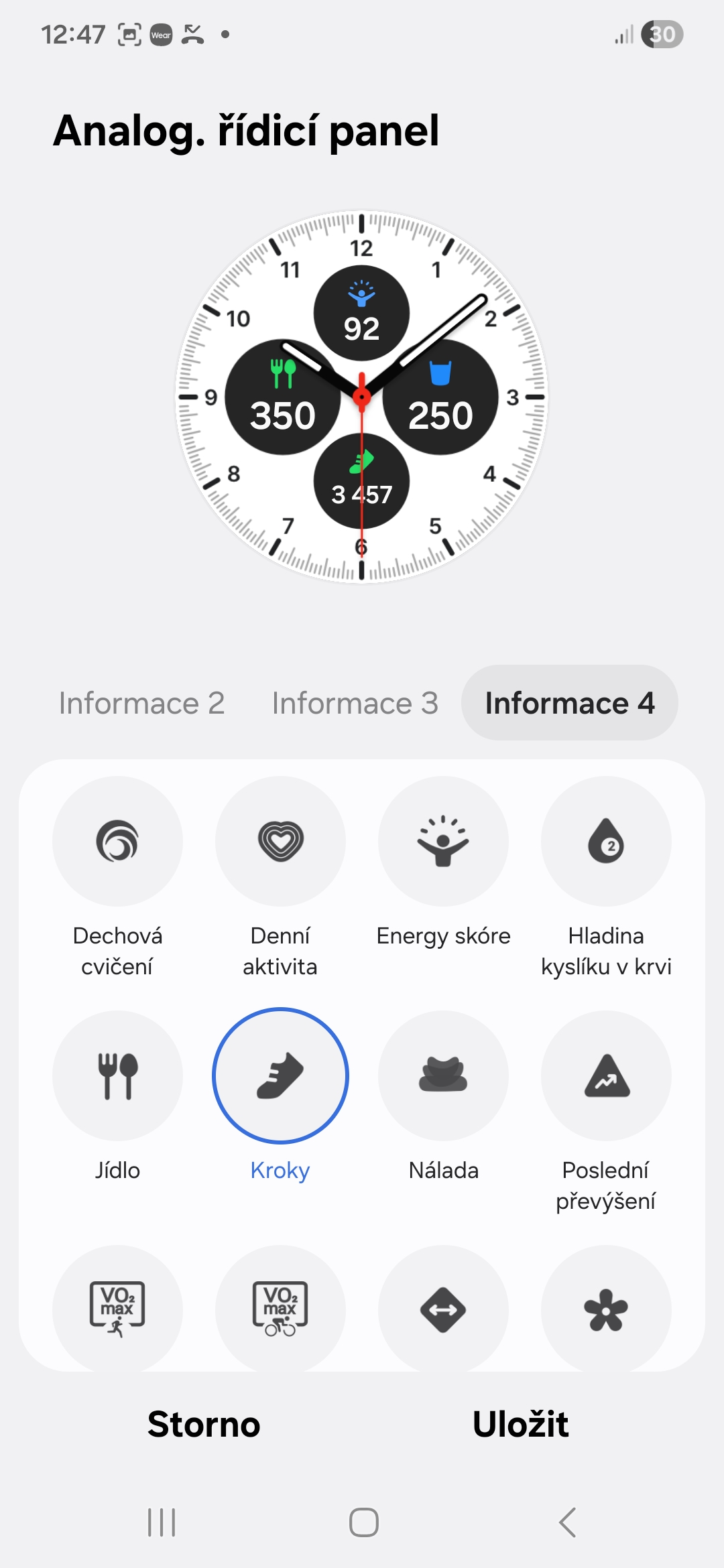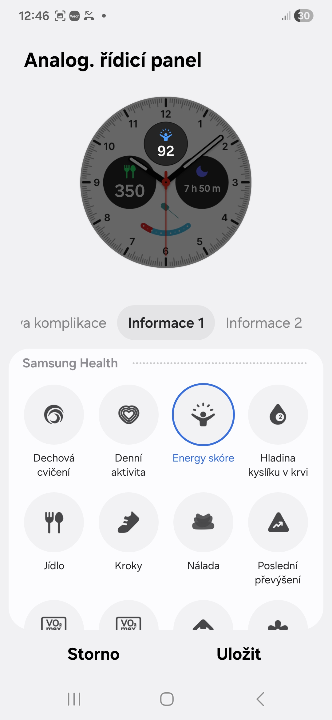 Každý digitální či analogový ciferník na vašich Galaxy Watch si můžete přizpůsobit tak, aby odpovídal vašemu životnímu stylu/zdraví. U každého si můžete přidat komplikace (Samsung jim říká informace) ukazující to, co je pro vás z hlediska vašeho životního stylu či zdraví důležité. V jedné může být například vaše denní aktivita, ve druhé kroky, ve třetí příjem kalorií, ve čtvrté skóre energie, v páté spánek apod. Záleží na tom, kolik komplikací daný ciferník nabízí (obvykle je to mezi dvěma až pěti).