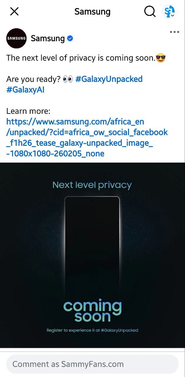 Teaser Galaxy S26 Ultra potvrzuje předchozí úniky. Nejpokročilejší model řady Galaxy S26 dostane mnohem oblejší hrany než jeho předchůdce a skutečně nabídne funkci Privacy Display, která při pohledu ze strany znemožní čtení dat na displeji. To se hodí zejména u bankovních aplikací nebo konverzačních aplikací typu WhatsApp, u nichž nechcete, aby vám někdo nahlížel přes rameno.