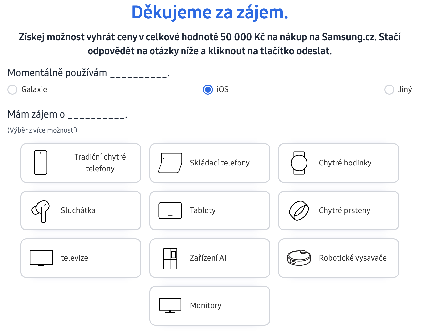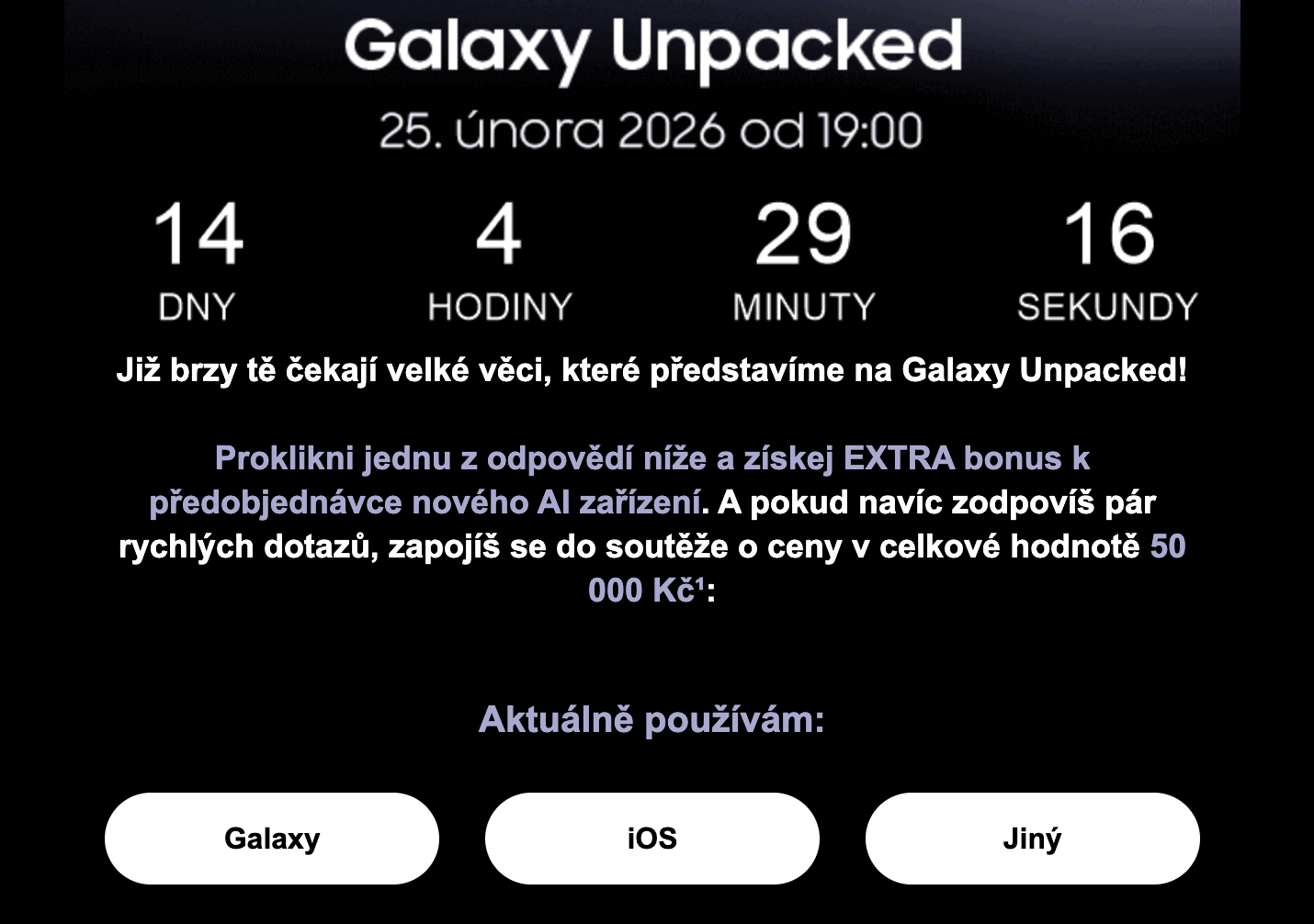 Samsung mi jako registrovanému fanouškovi poslal e-mail s všeříkajícím předmětem: Galaxy Unpacked se blíží. A je to pravda, protože tu bude už za 14 dní. Během těchto dvou týdnů ale máte stejně jako já možnost zapojit se do soutěže o 50 tisíc Kč. V e-mailu stačí prokliknout jednu z odpovědí, jestli používáte zařízení Galaxy nebo to s iOS, čímž získáte EXTRA bonus k předobjednávce nového AI zařízení. Když následně ještě odpovíte na pár otázek, budete zařazeni do soutěže o finanční odměnu. Účast je možná od 11. 2. 2026 do 22. 2. 2026. Vyhlášení proběhne 23. 2. 2026.