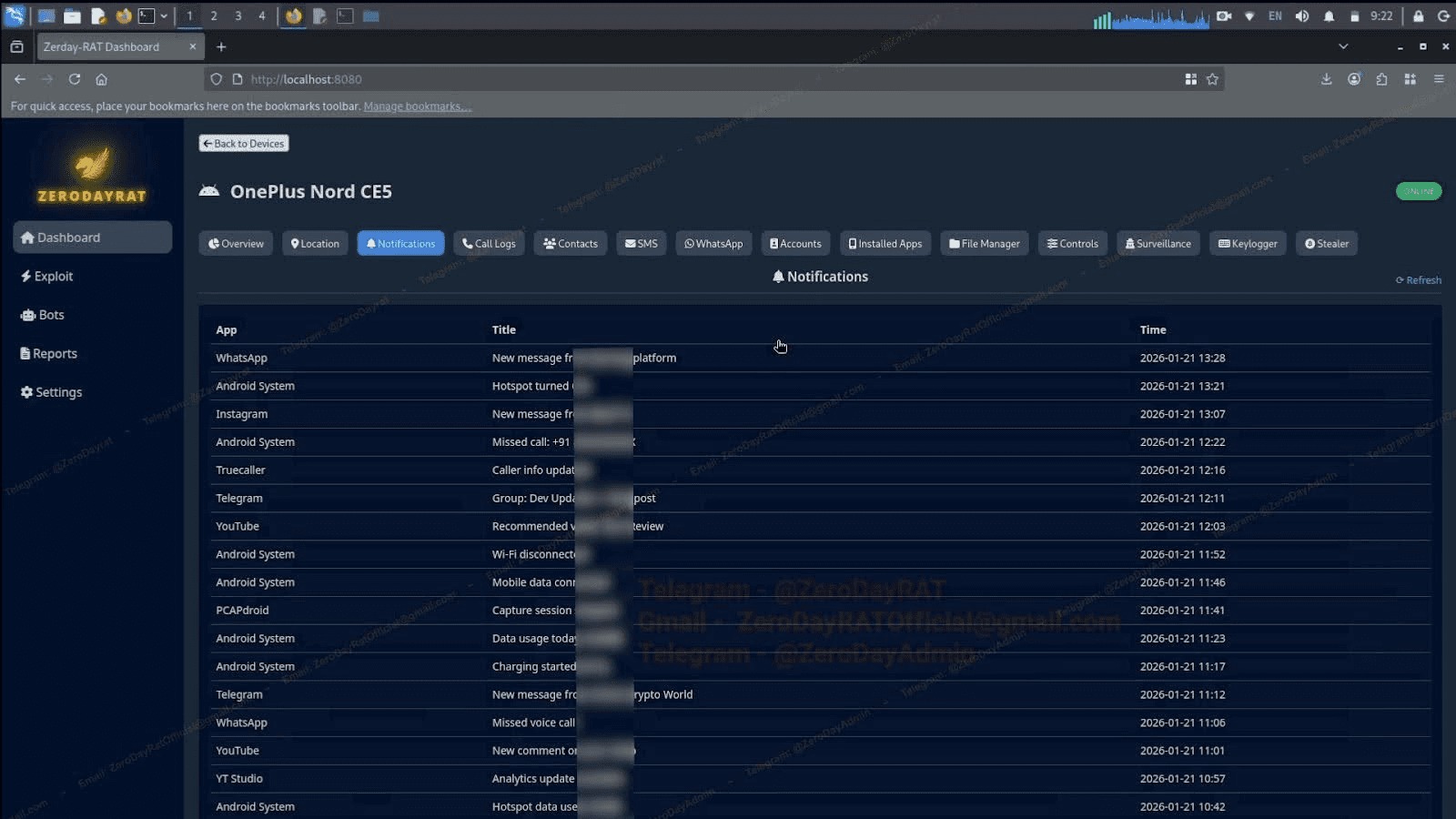 ZeroDayRAT obsahuje škodlivý soubor APK, který infikuje zařízení, a řídicí panel, který poskytuje hluboký vhled do dat na infikovaných zařízeních. Po instalaci souboru APK poskytuje řídicí panel přístup k informacím o zařízení, včetně modelu, operačního systému, telefonního čísla, údajům o SIM kartě a k dalším informacím. Kromě toho může odhalit, které aplikace jsou v zařízení nainstalovány, a také protokol všech příchozích oznámení.