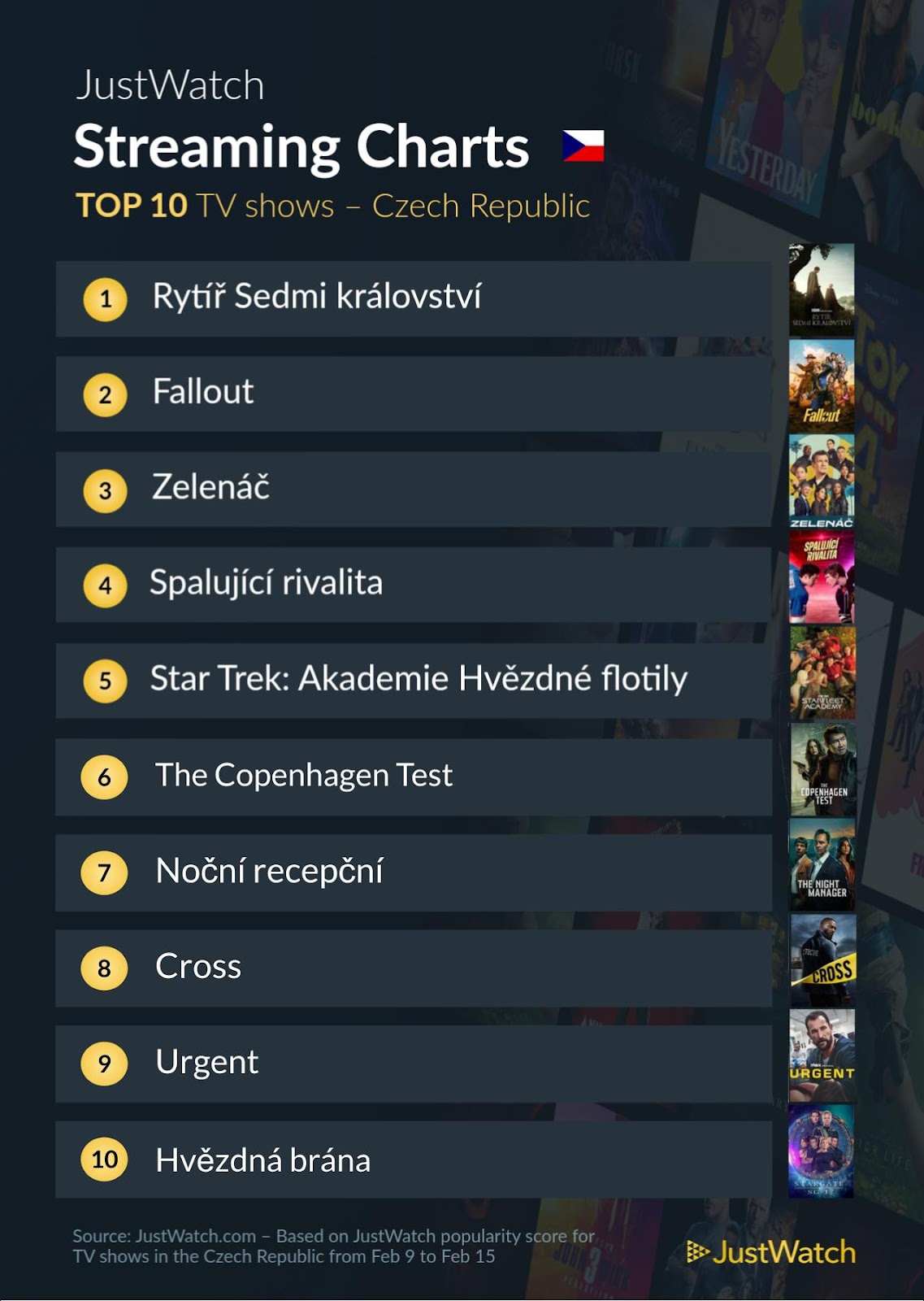 Jednička mezi seriály zůstává jasná. Opět vyhrál Rytíř Sedmi království z HBO Max, který měl za sebou teprve 4. díl, a hned za ním byl Fallout z Prime Video. Na třetí místo se vrátil Zelenáč ze sítí Netflix a Disney+, který si prohodil pozici se Spalující rivalitou, která je k dispozici na HBO Max. Netflix tedy pořád čeká na nějaký velký jarní hit, který by mu pomohl opanovat řebříček streamu. Ten byl tvořen na základě zájmu uživatelů platformy JustWatch od 9. do 15. února 2026.