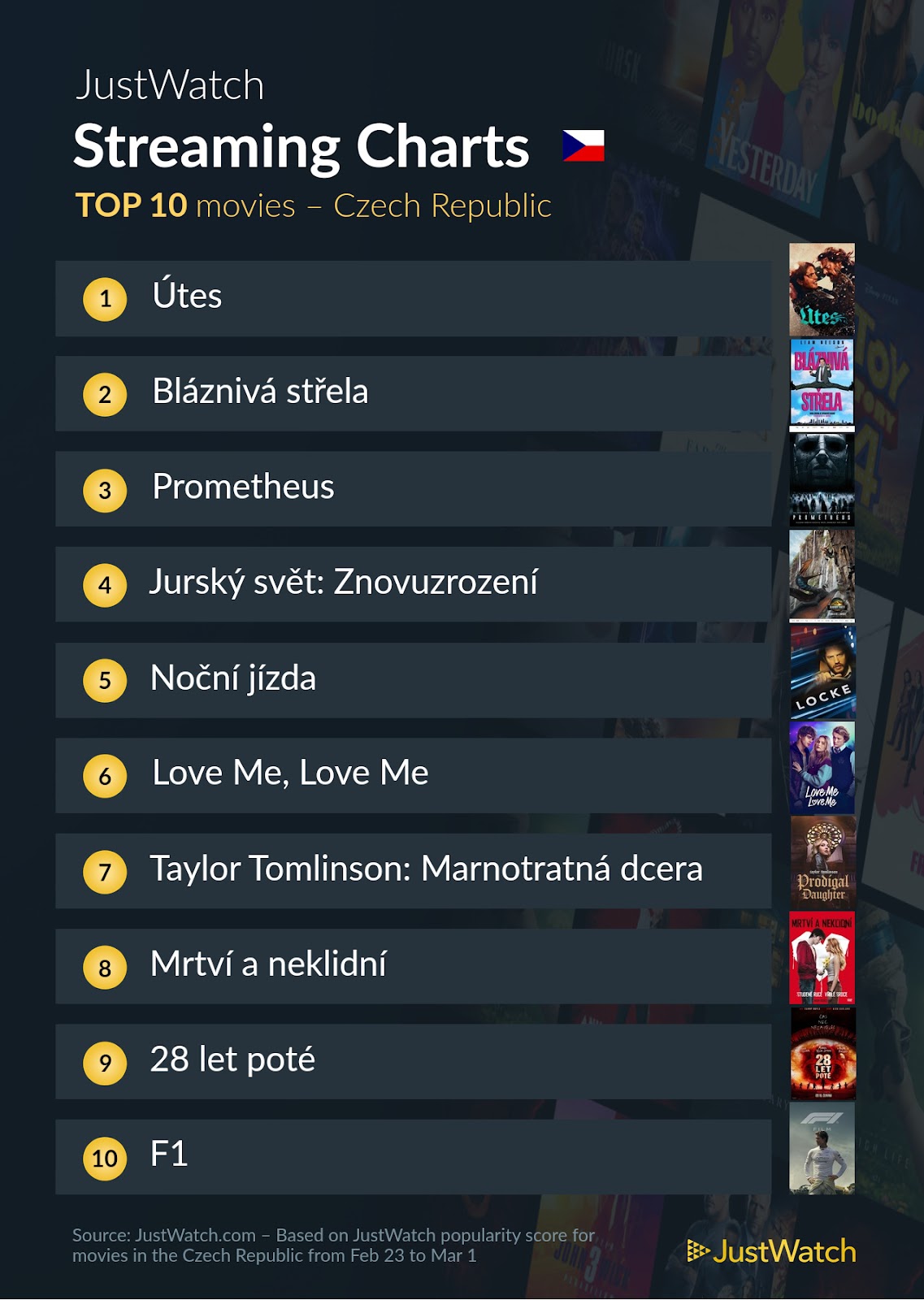 V roce 2026, tedy zatím za ty dva jeho měsíce, se ještě žádný film neudržel v zájmu diváků JustWatch v TOP 10 na prvním místě po dva týdny za sebou. Máme tak opět nové číslo 1, kterým je tentokrát snímek Útes, který můžete vidět v Prime Video. Na druhou pozici tedy klesla loňská Bláznivá střela, která je k dispozici ve SkyShowtime, následovaná filmem Prometheus. Toho můžete vidět v sítích Disney+ a Netflix.