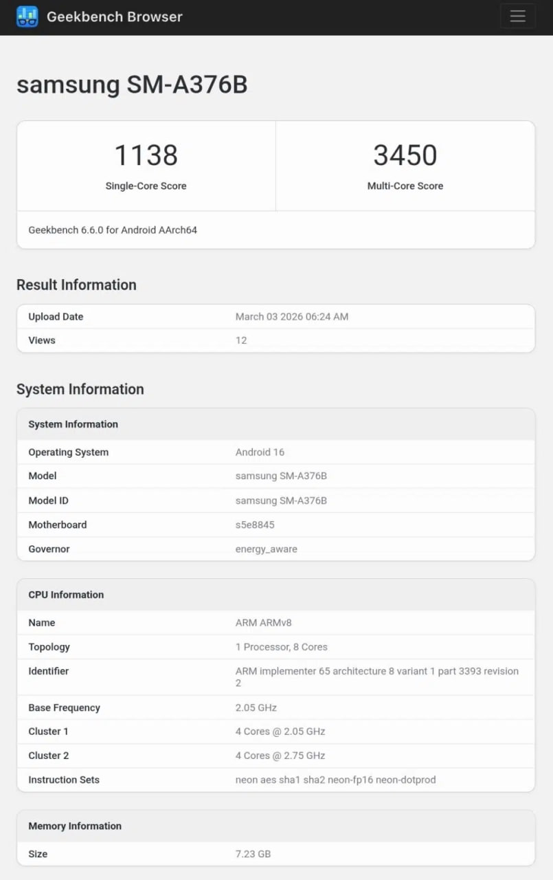 • Samsung Galaxy A37: 1 138 (jedno jádro) / 3 450 (více jader)