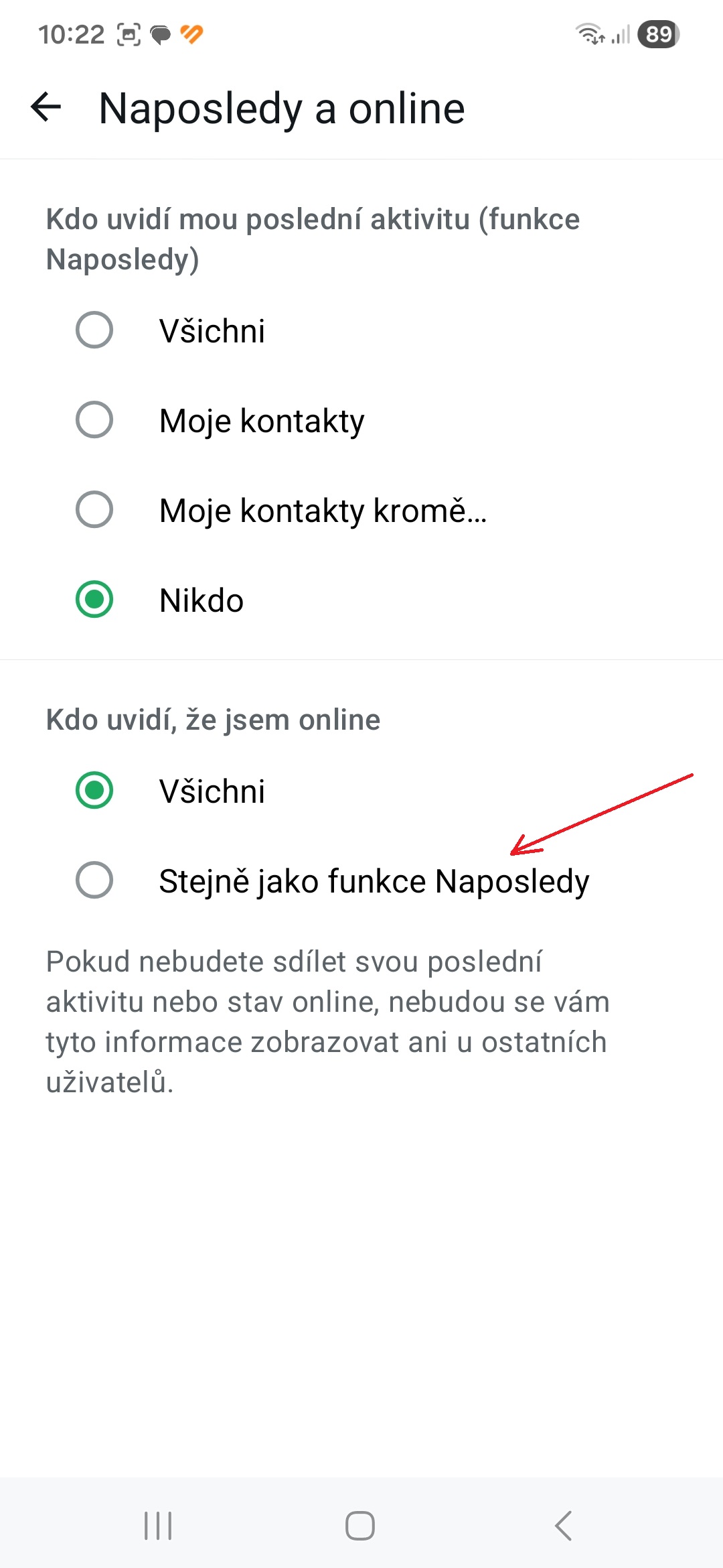 - V sekci Kdo uvidí, že jsem online nastavte možnost Stejně jako funkce Naposledy.