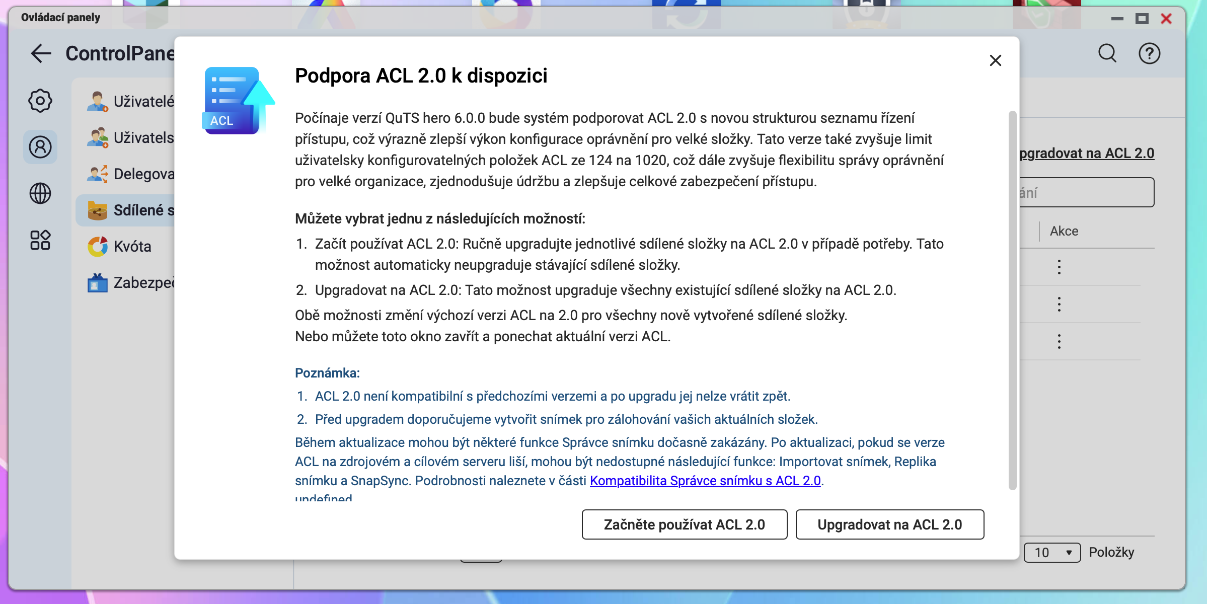 Beta 3 je hlavně o dotažení detailů. Pokud používáte NAS jako Domain Controller, můžete nově nastavit funkční úroveň domény až na Windows Server 2016. Při nastavování sdílených složek systém kontroluje verzi ACL a nedovolí použít konfiguraci, která by překročila limit počtu ACL záznamů. V desktopu se zlepšily notifikace aktualizací – App Center ukáže odznáček s počtem aktualizací a u aplikací nabídne „guided update, aby vám žádná aktualizace neutekla.