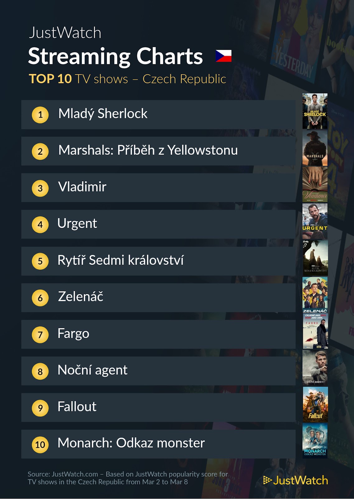 Rytíř Sedmi království z HBO Max po mnoha týdnech prvenství vyklízí pole, a to i proto, že už má za sebou odvysílaný poslední díl. Spadl tedy na 5. příčku. Novou jedničkou tak je tak Mladý Sherlock, který je k vidění v Prime Video. Dvojkou byl v minulém týdnu seriál Marshals: Příběh z Yellowstonu, který můžete vidět ve SkyShowtime. Na třetí pozici je pak Netflix novinka se jménem Vladimir. Žebříček byl tvořen na základě zájmu uživatelů platformy JustWatch od 2. do 8. března 2026.