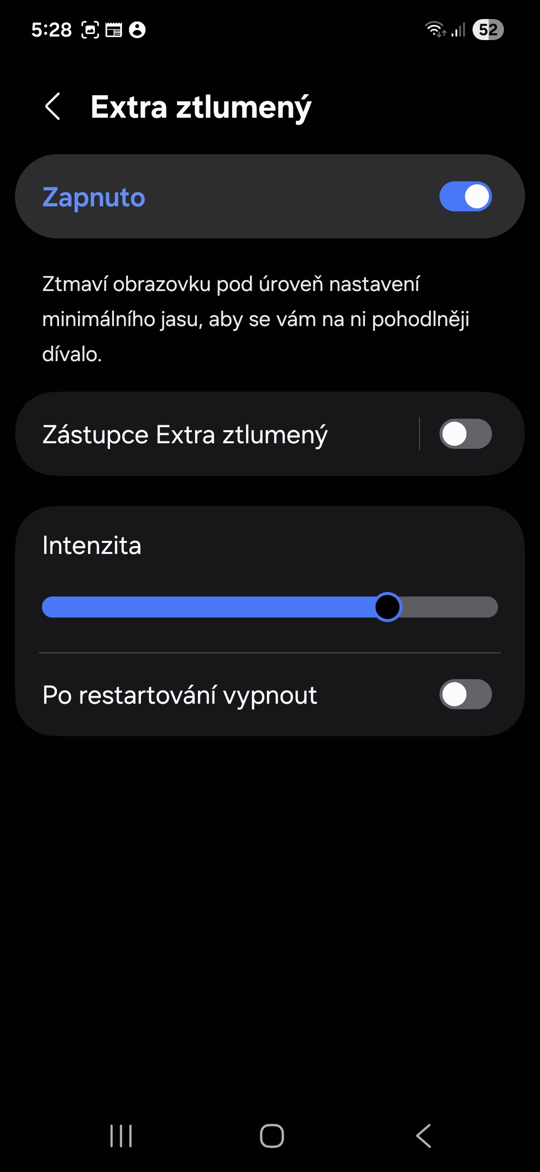 Řeč je o funkci jménem Extra ztlumený displej. Ta sníží intenzitu barev a svítivost pixelů ještě o úroveň níž, než je minimální jas na posuvníku, což nejen že výrazně uleví vašemu zraku při večerním prohlížení obrazovky, ale také baterii vašeho Samsung zařízení (zejména když máte posledních 5 %). Dříve jsem pro ochranu zraku při večerním čtení používal funkci Pohodlí pro oči, která odfiltruje modré světlo (výsledkem čehož je zežloutnutí obrazovky), poté jsem ale objevil tuto vychytávku, která je podle mé zkušenosti účinnější, i když je primárně určená pro zrakově postižené.