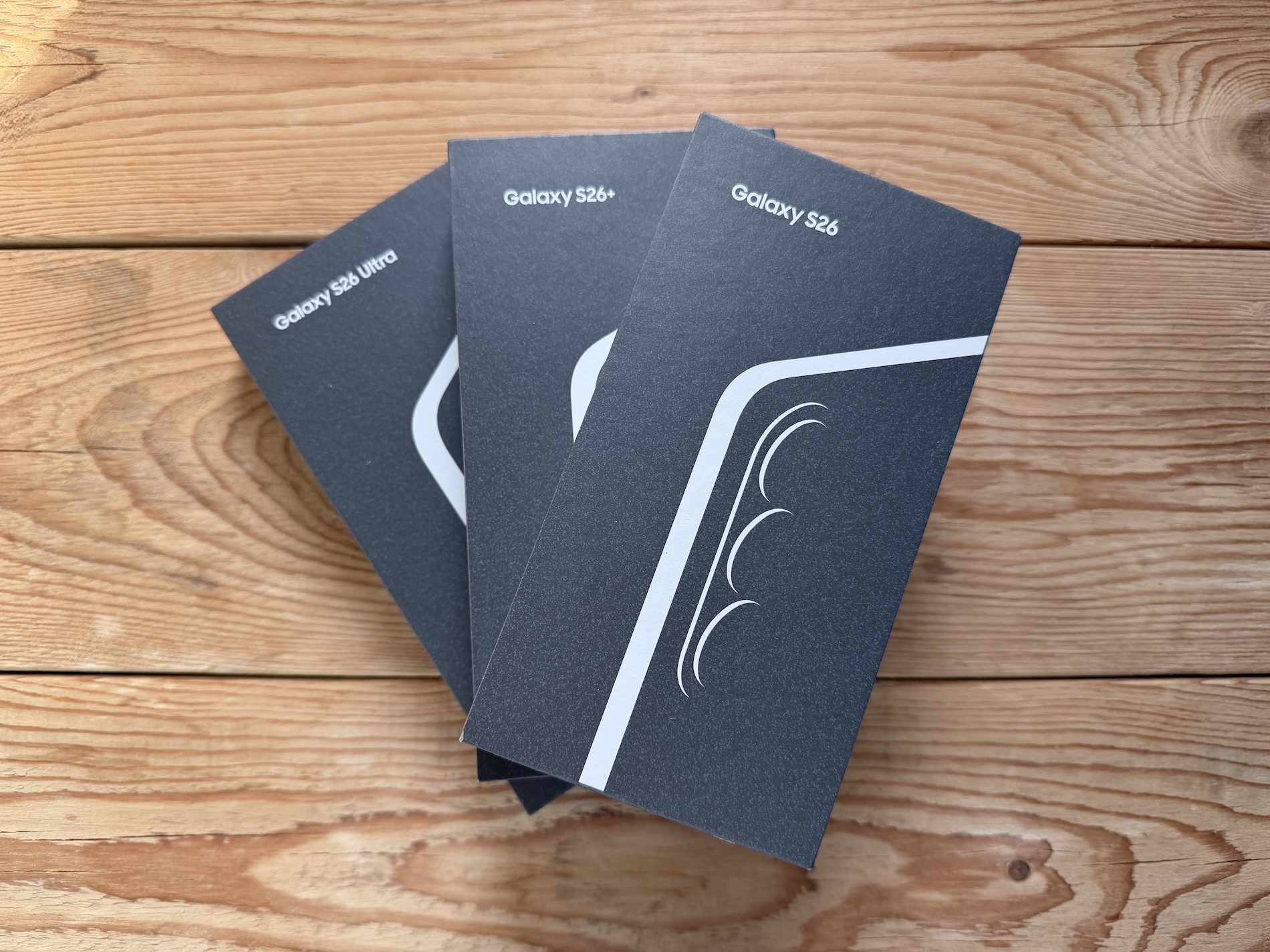 K dispozici máme Galaxy S26 Ultra a S26+ v černé a Galaxy S26 ve fialové barvě. Krabičky jsou tradičně minimalistické a zobrazují jen siluetu telefonu s označením přítomného modelu. Jaká je barva uvnitř poznáte pouze podle popisu na nálepce, kterou musíte odtrhnout a jejím kraji, který právě danou barvu symbolizuje.
