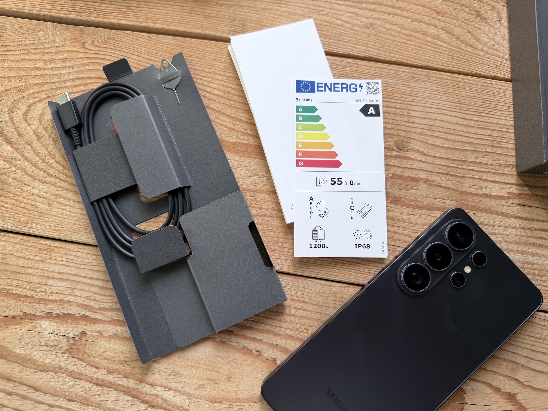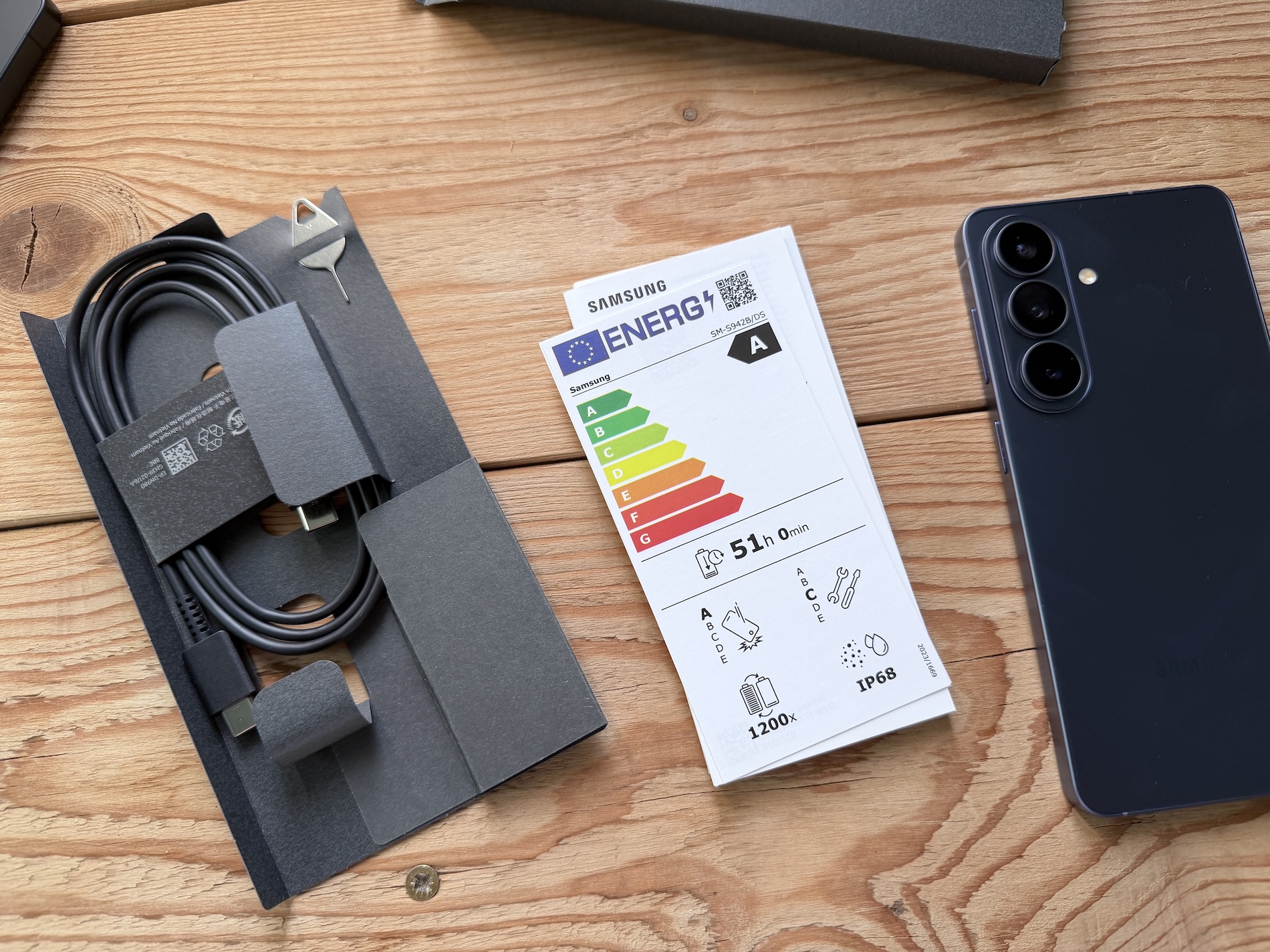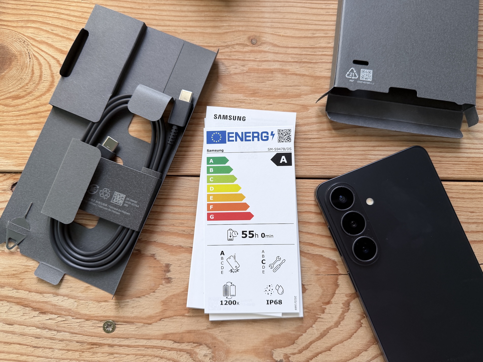 Štítek zákazníky informuje o energetické náročnosti, výdrži baterie, počtu jejích výrobcem garantovaných nabíjecích cyklů, odolnost telefonu a opravitelnost. To tedy dle standardu EU. Možná škoda, že jej ale zákazník vidí až po koupi telefonu. K tomu navrhuji pro evropské komisaře drobné zlepšení, tedy aby byl štítek lepený přímo na zadní stranu balení zařízení. Nic víc balení neobsahuje, a to vlastně už roky. Není tu adaptér, nejsou tu sluchátka. Na to všechno už jsme si zvykli a nikoho to nemůže překvapit.
