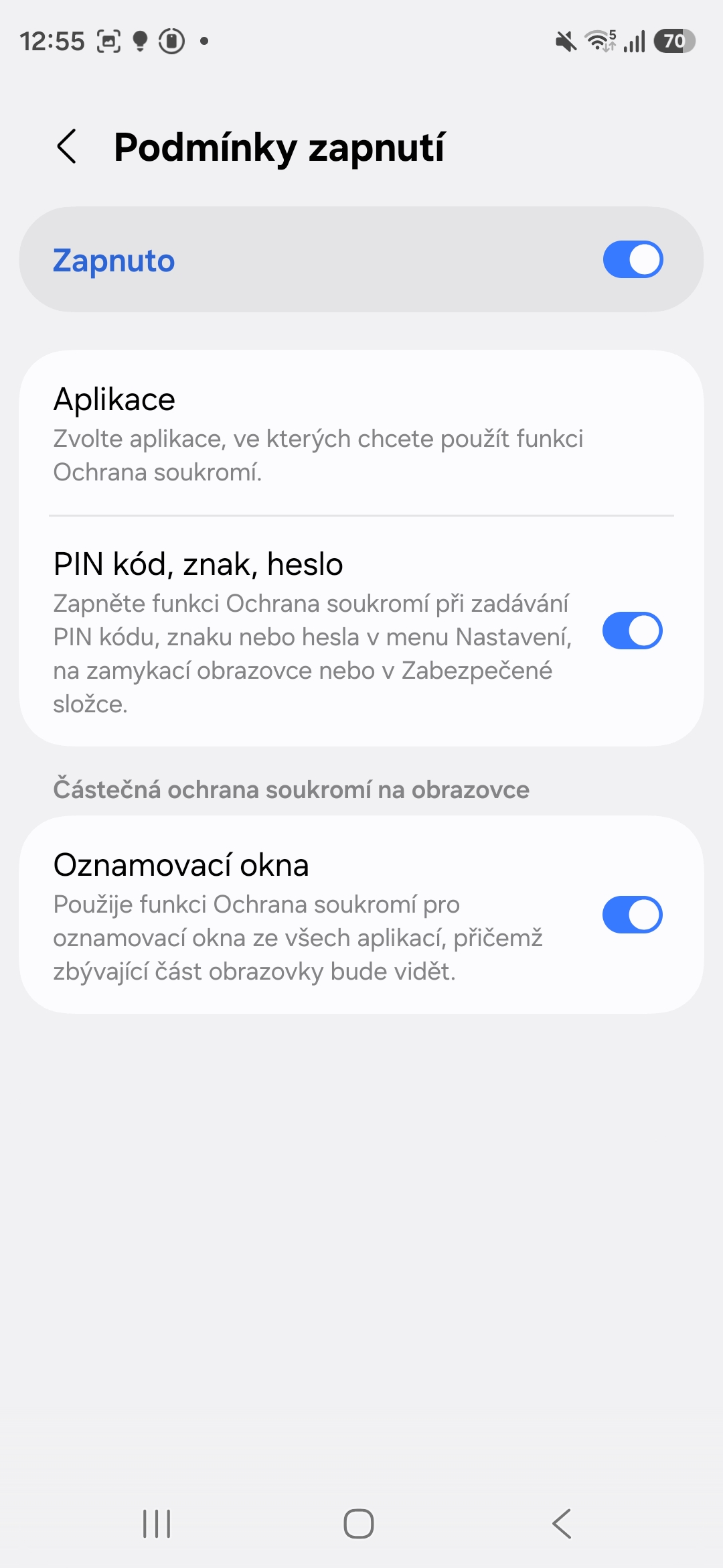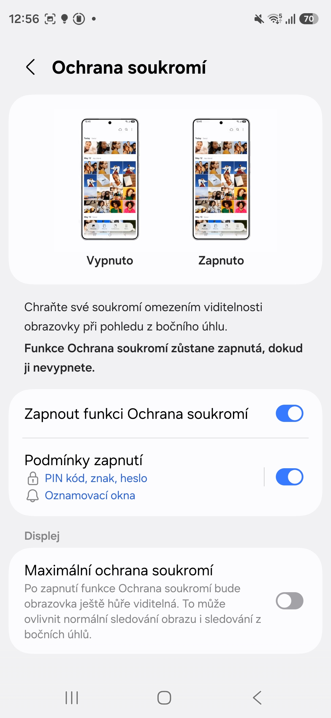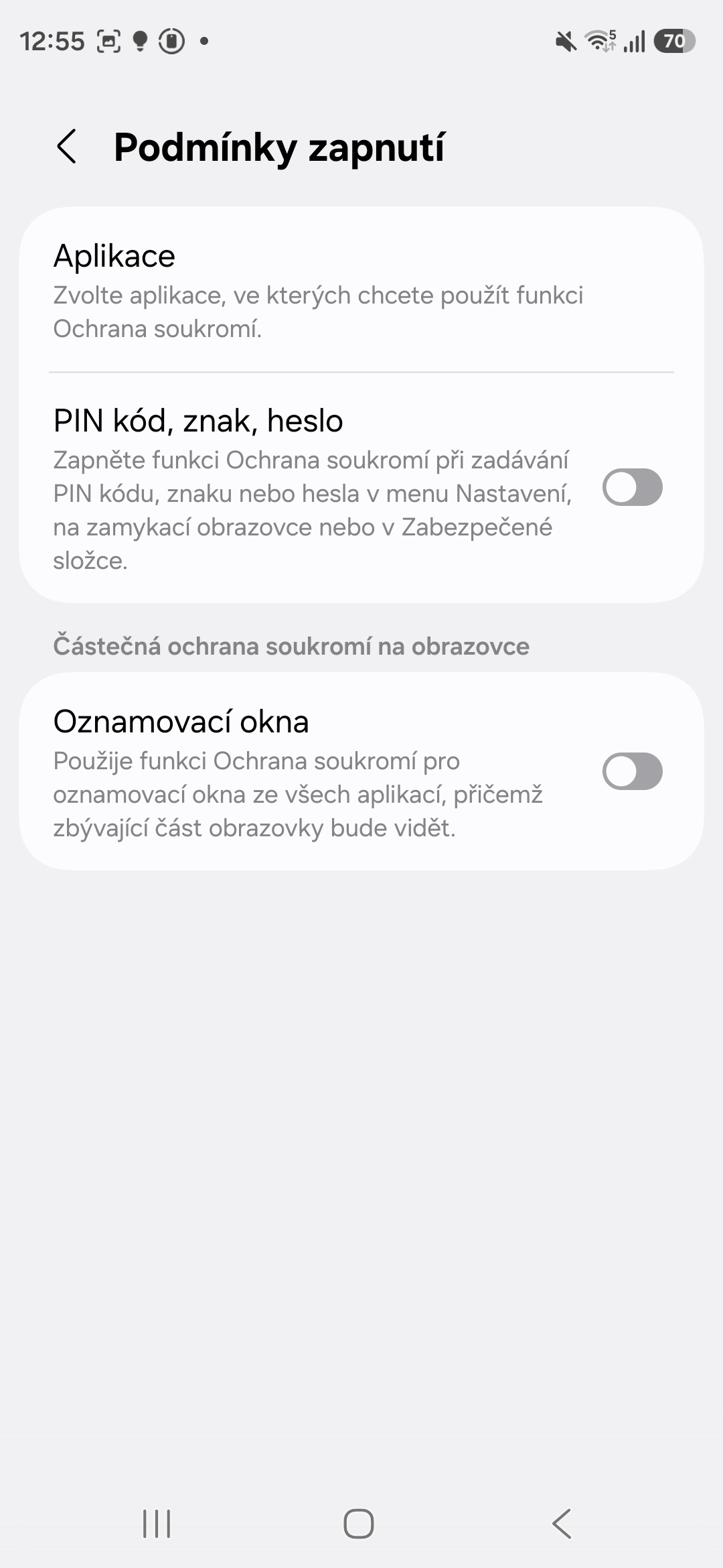 Když půjdete do nabídky Displej a klepnete na text Ochrana soukromí, najdete tu Podmínky zapnutí. V nich lze aktivovat vybrané aplikace, ve kterých má být Privacy Display zapnutý (prakticky jde o všechny, které máte v zařízení nainstalované), používání PIN kódu, znaku nebo hesla, aby je nikdo neodečetl a oznamovací okna.