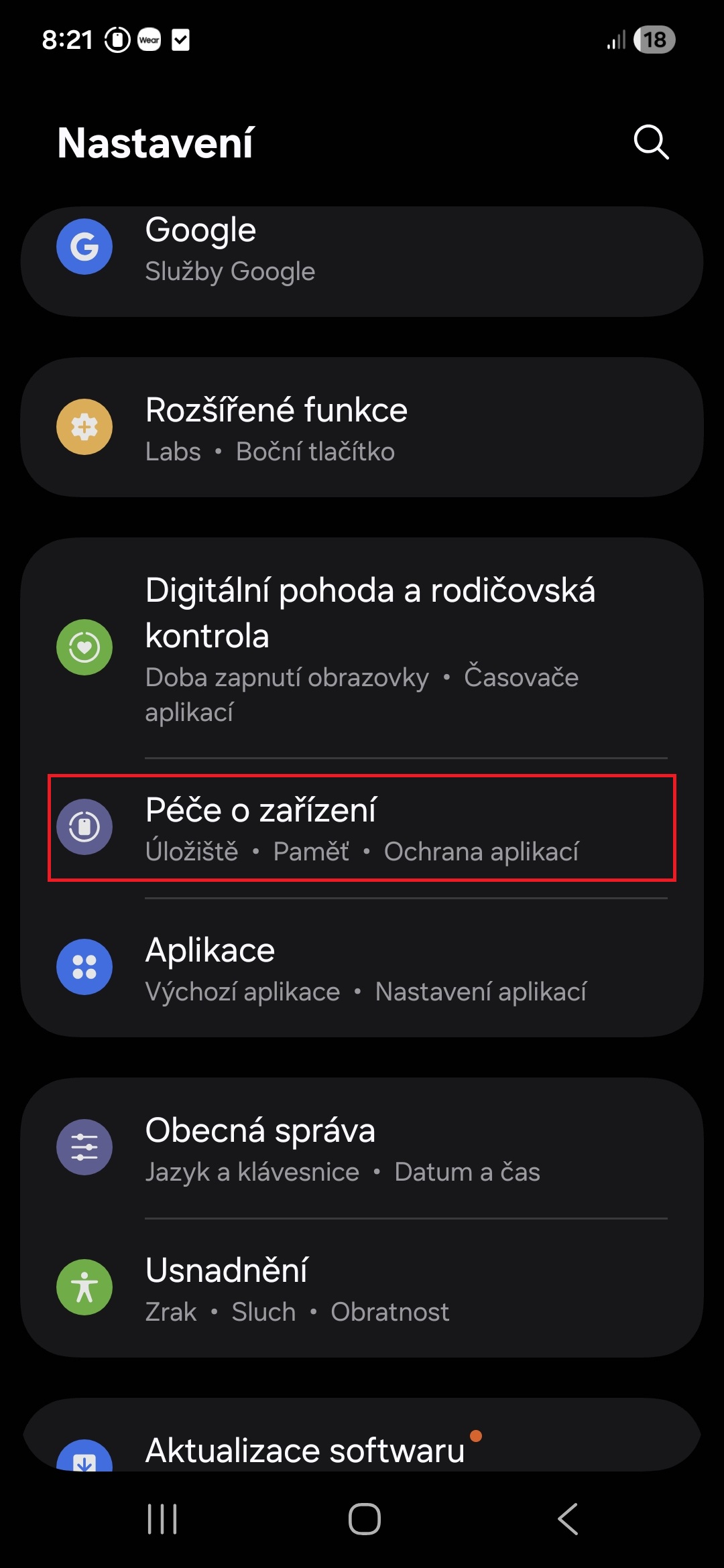- Klepněte na nabídku Péče o zařízení.