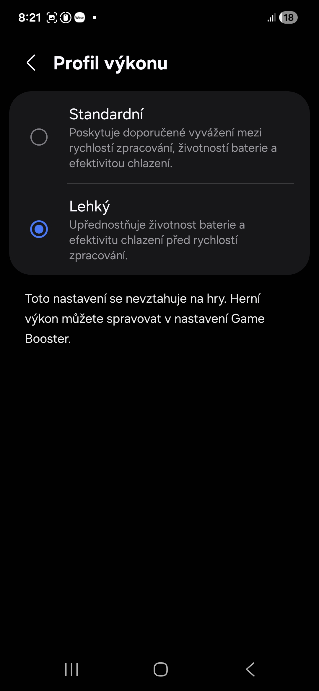 Konkrétně hovořím o funkci Profil výkonu, přesněji řečeno o „lehkém“ profilu. Ten upřednostňuje výdrž baterie před plným výkonem, který naopak preferuje výchozí „standardní“ režim. Díky lehkému profilu si budete moci stále užívat vysokou obnovovací frekvenci displeje, Always-On Display i 5G sítě, protože zahrnuje pouze snížení rychlosti procesoru. Rozdíl při procházení webu nebo psaní e-mailů nepoznáte, ale váš telefon bude chladnější a na jedno nabití vám vydrží déle. A pokud jde o hraní, to má na starosti služba GOS (Game Optimization Service), takže se nemusíte bát, že v rámci lehkého profilu by hry byly pomalejší.