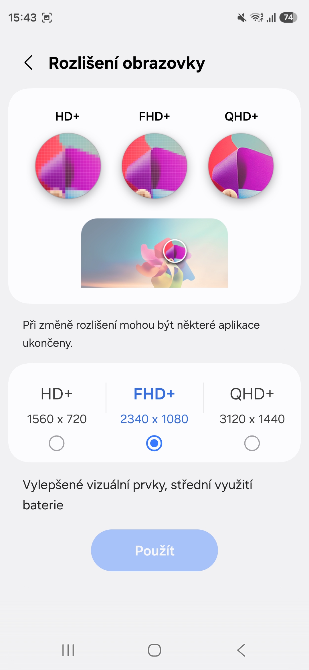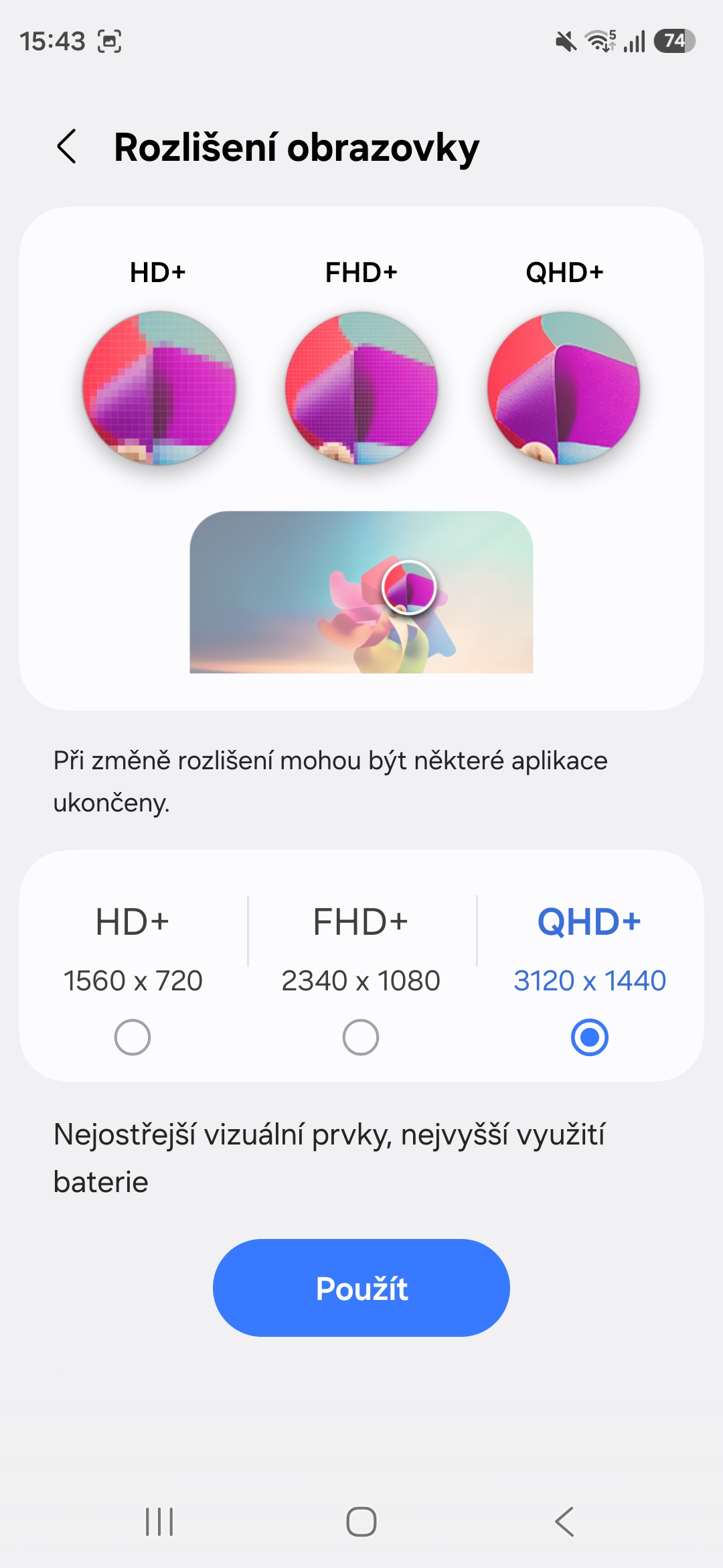 Standardně váš telefon běží v režimu FHD+ (2340 x 1080 pixelů). Pro běžné používání je to dostačující, ale pokud držíte v ruce technologickou špičku, jakou Galaxy S26 Ultra prostě je, je škoda nevyužít nativní rozlišení panelu 3120 x 1440 pixelů (QHD+). Stejná situace mimochodem platí i pro model Galaxy S26+, který rovněž disponuje tímto jemným rozlišením, ale v základu ho má „přiškrcené“.