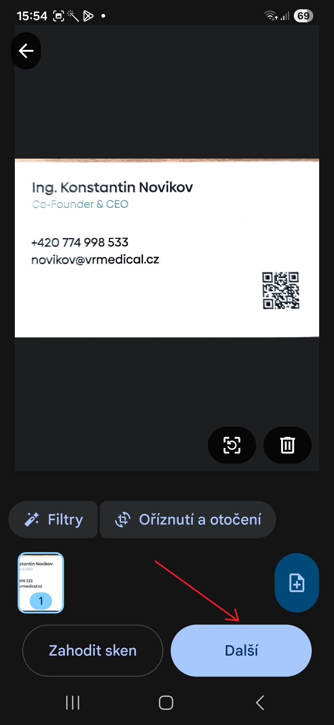 - Kartu nyní můžete oříznout či otočit nebo na ni aplikovat různé filtry. Pokud jste s úpravami hotoví či kartu nechcete nijak upravovat, klepněte na tlačítko Další.