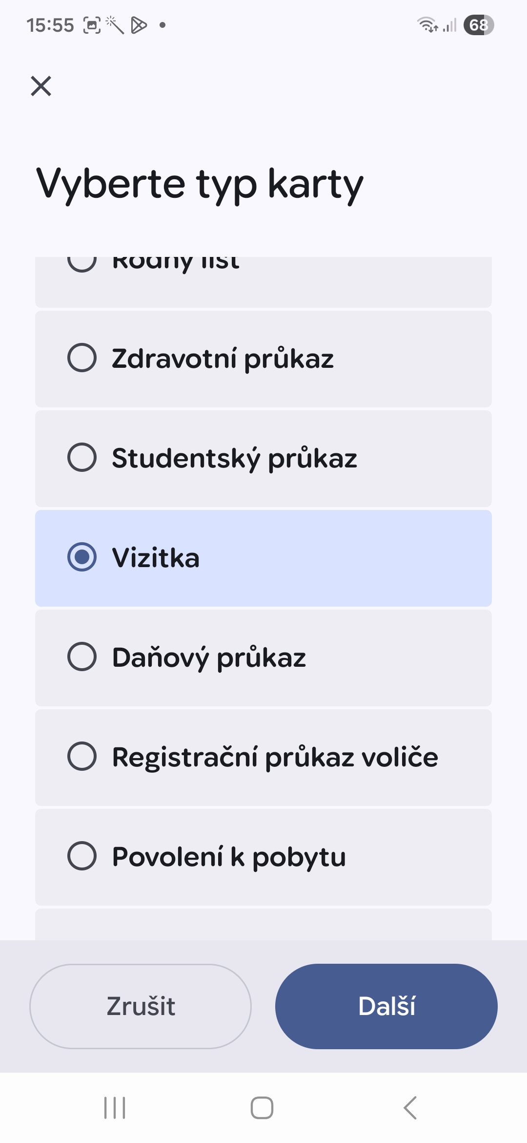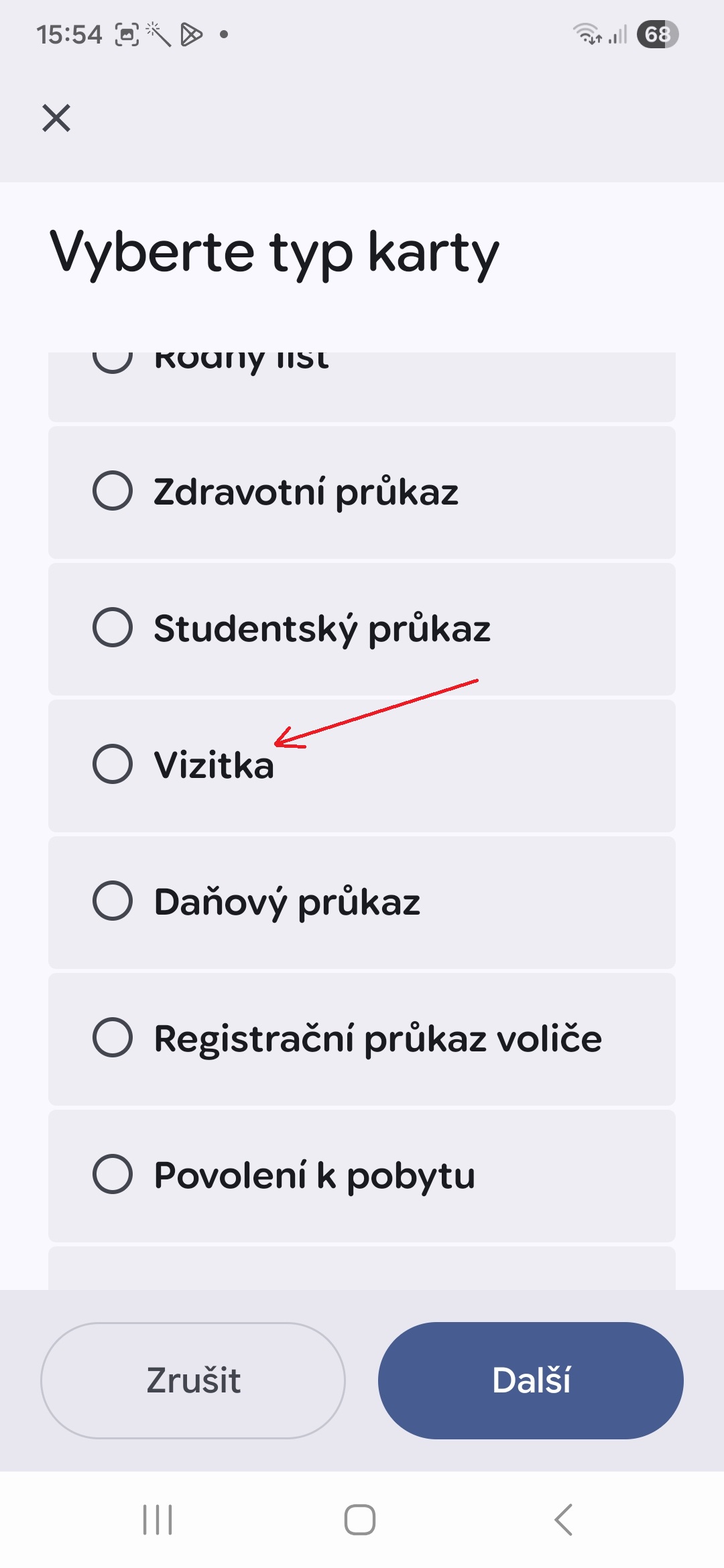 - Vyberte se seznamu typ karty.