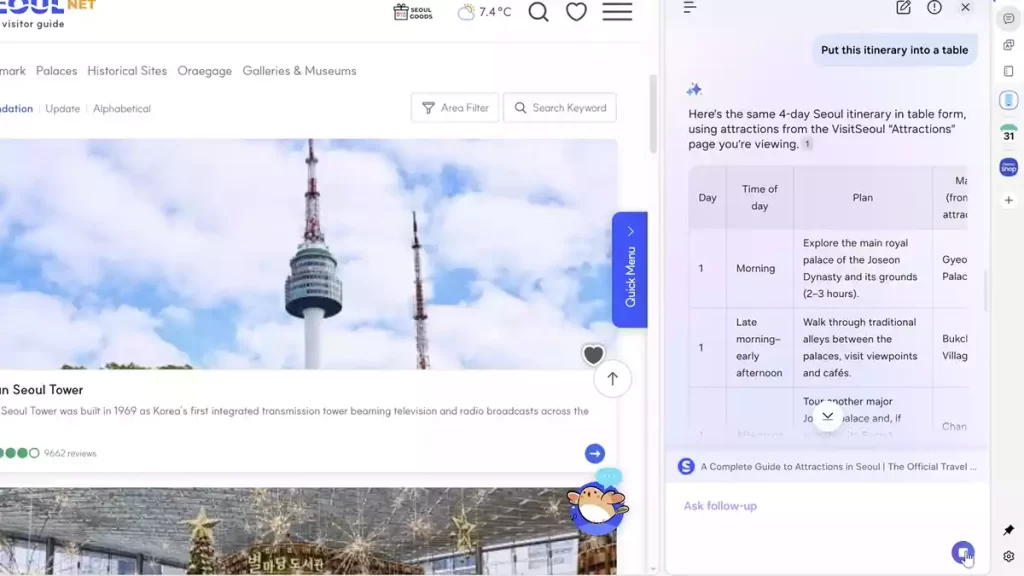 • Pochopení konextu: Můžete požádat prohlížeč, aby na základě aktuálně otevřené stránky vytvořil časový plán pro návštěvu určitého místa s itinerářem. Umělá inteligence stránku prohlédne a na obrazovce zobrazí plán.