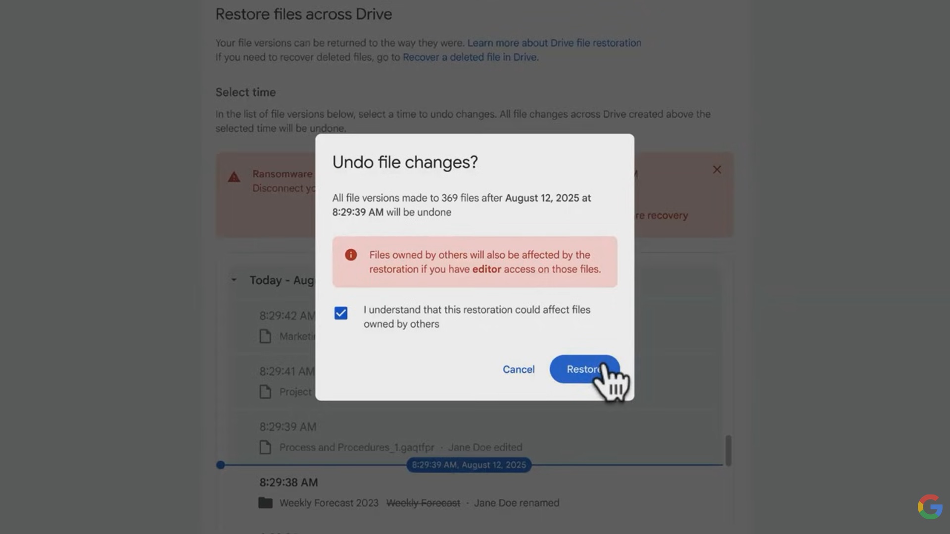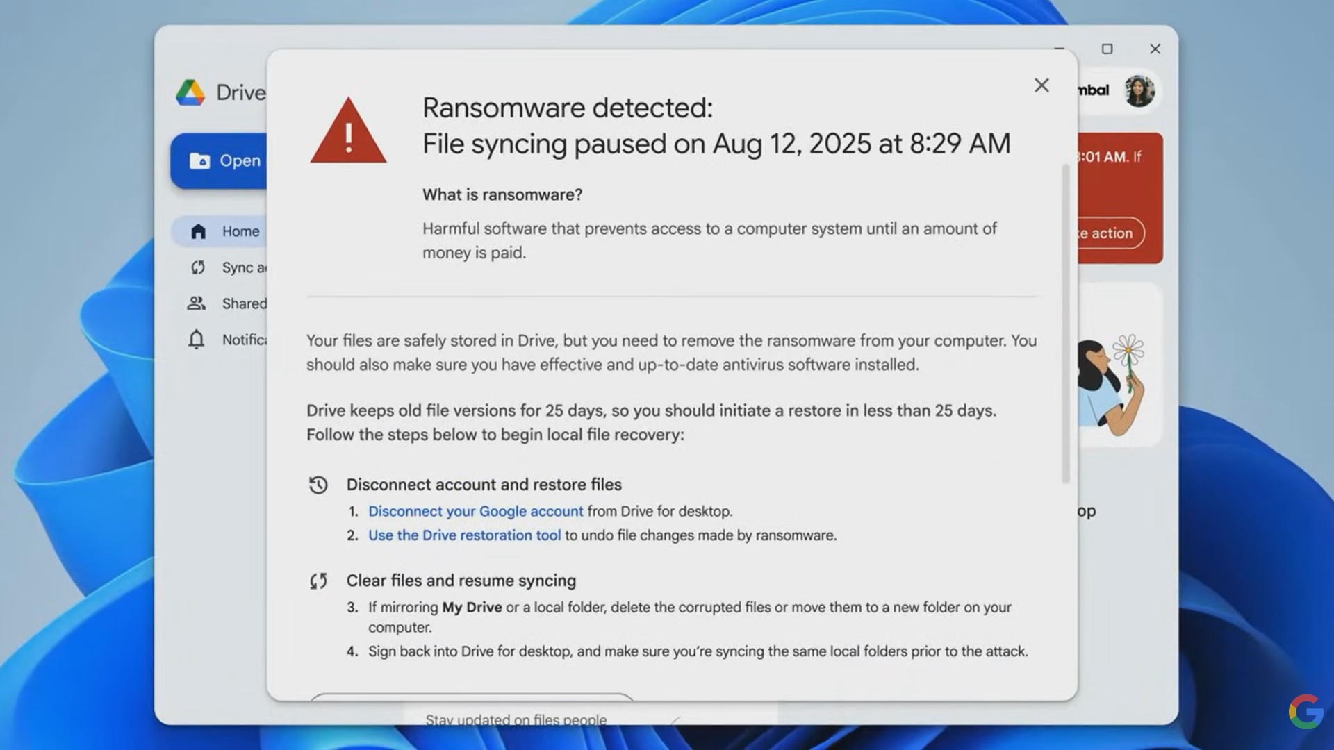 Google už před časem začal v beta verzi Disku Google testovat možnost obnovy uložených souborů. Zároveň se s pomocí AI pokoušel detekovat škodlivé chování a možné napadení Disku. Zkušební provoz se zřejmě osvědčil, a tak už by nové ochranné prvky měly být dostupné pro všechny uživatele.