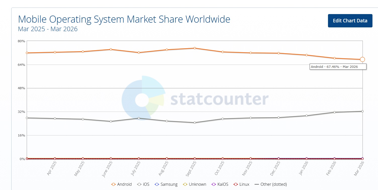 • v březnu 2025 bylo mezi lidmi 71,95 % zařízení s Androidem