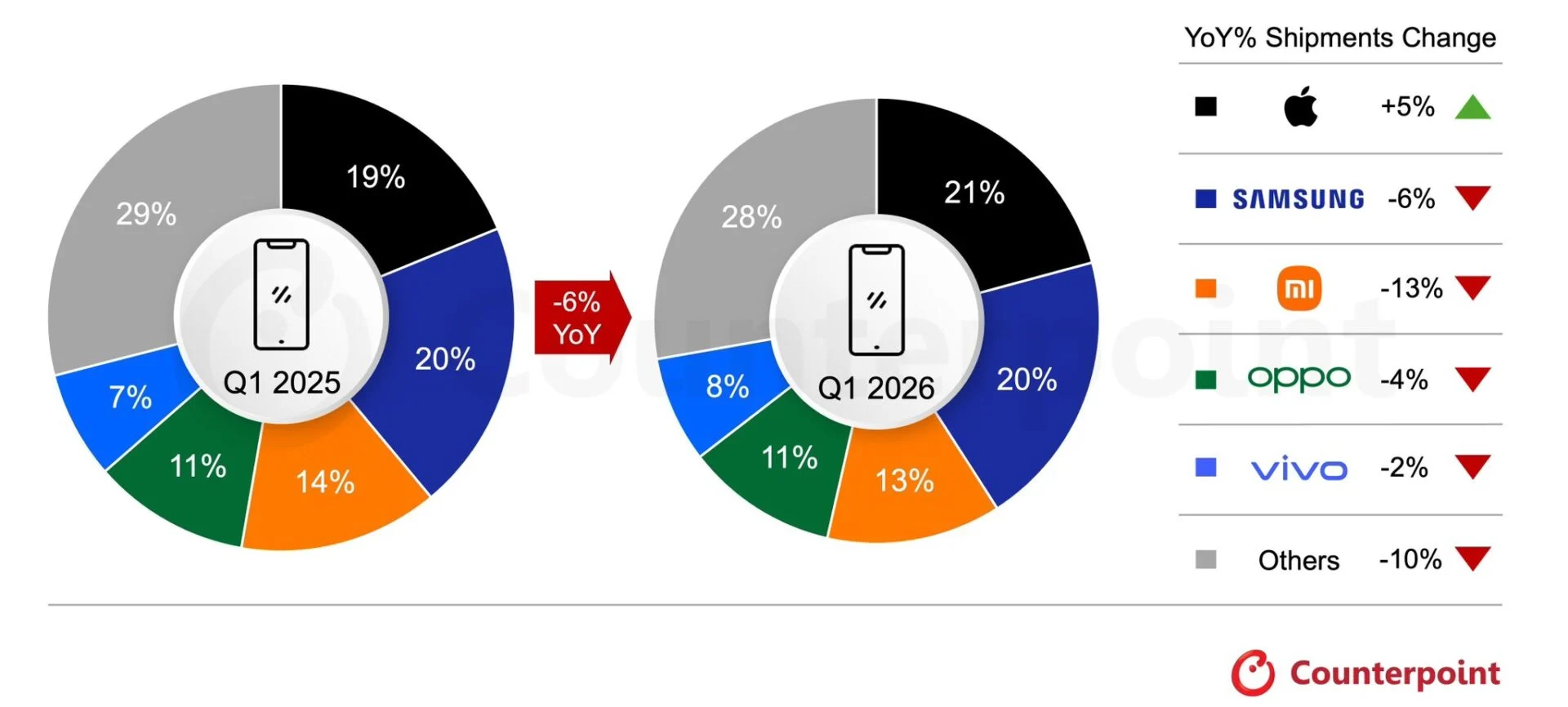- Counterpoint Research uvádí, že Samsung v 1. kvartále 2026 držel na globálním trhu 20 %, zatímco Apple získal 21 %