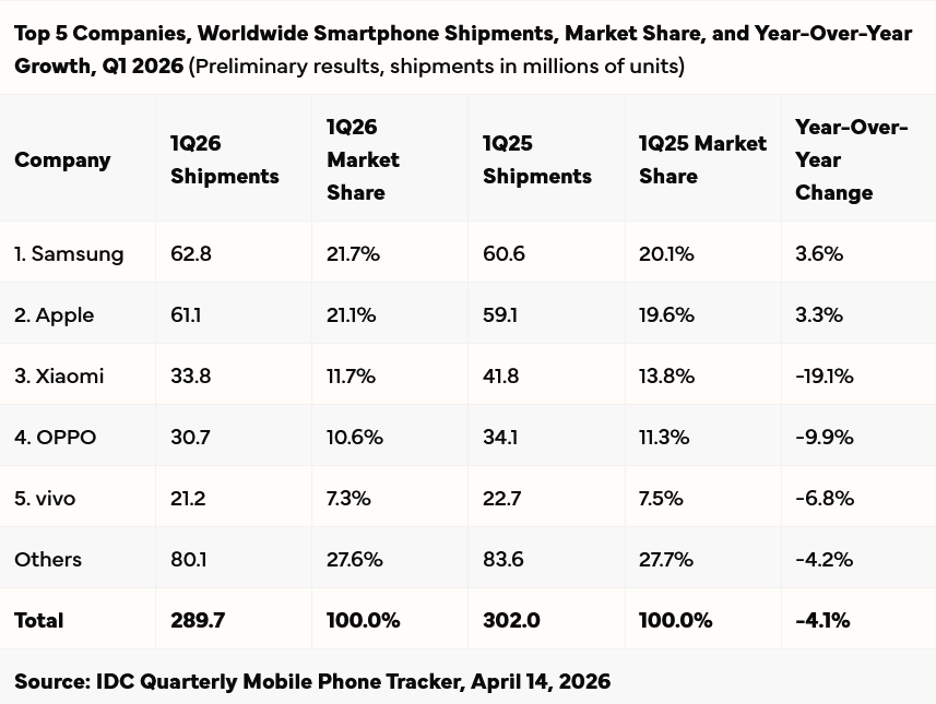 Krize se podle analytické společnosti IDC kupodivu zatím příliš nedotkla Samsungu. Ačkoliv sérii Galaxy S26 vydal až koncem února, předobjednávky trhaly rekordy a o nové mobily byl dokonce o 10 % větší zájem než o Galaxy S25. I díky tomu Samsung rostl a podařilo se mu v prvním čtvrtletí prodat 62,8 milionu mobilů, čímž dosáhl 21,7% podílu na trhu. Meziročně si tak polepšil o 1,6 %. Hned v závěsu za ním je Apple, který také rostl, ale další výrobci zaznamenali pokles: