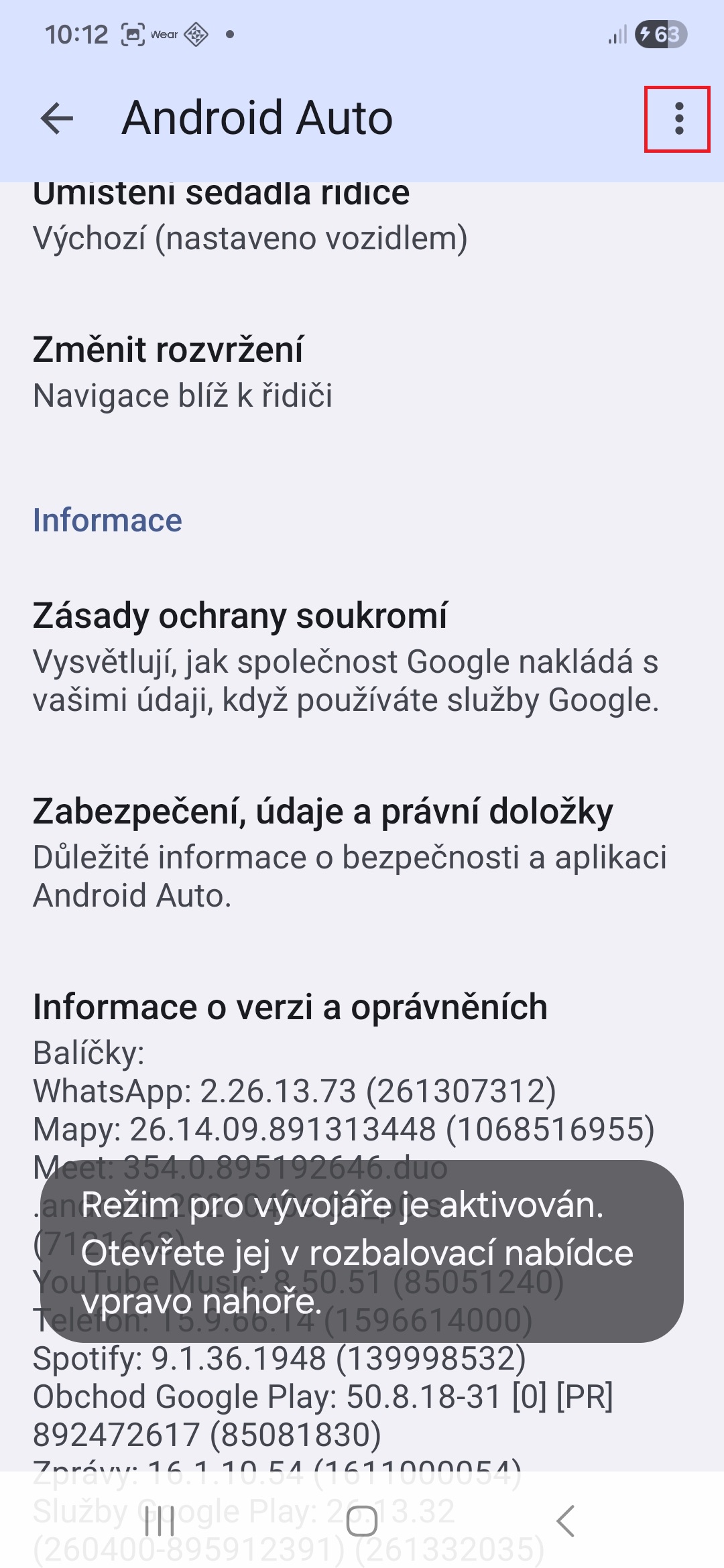 - Nyní v pravém horním rohu (pod třemi tečkami) najdete novou položku Nastavení pro vývojáře.