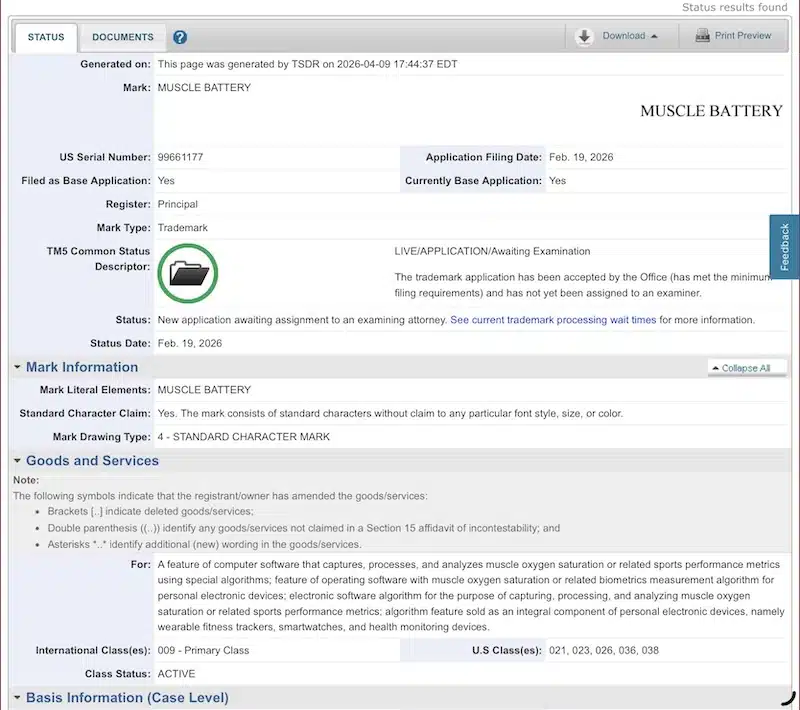 Jedním z nejzajímavějších úniků je registrace ochranné známky „Muscle Battery“. Na rozdíl od stávající funkce Body Battery, která sleduje celkovou energii těla, by Muscle Battery měla být zaměřena specificky na svalovou únavu a regeneraci. Informace navíc naznačují, že by mohlo jít o širší ekosystém. Je totiž možné, že nebude plně závislá pouze na senzorech v hodinkách, ale bude vyžadovat externí snímač pro dosažení maximální přesnosti.
