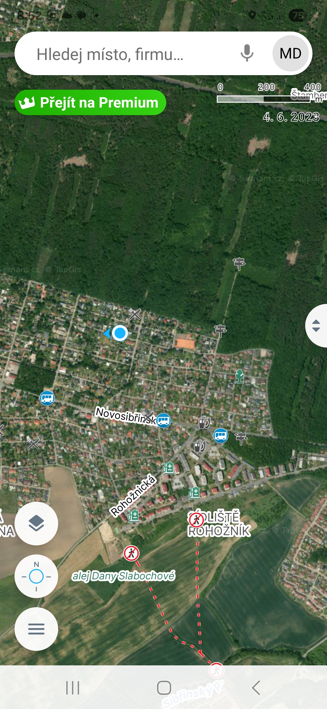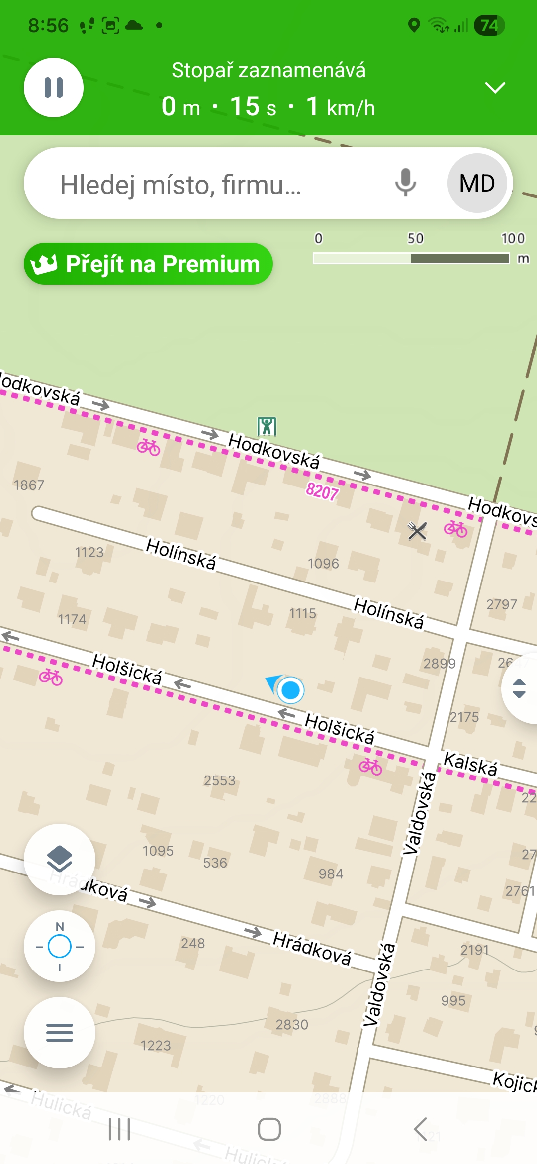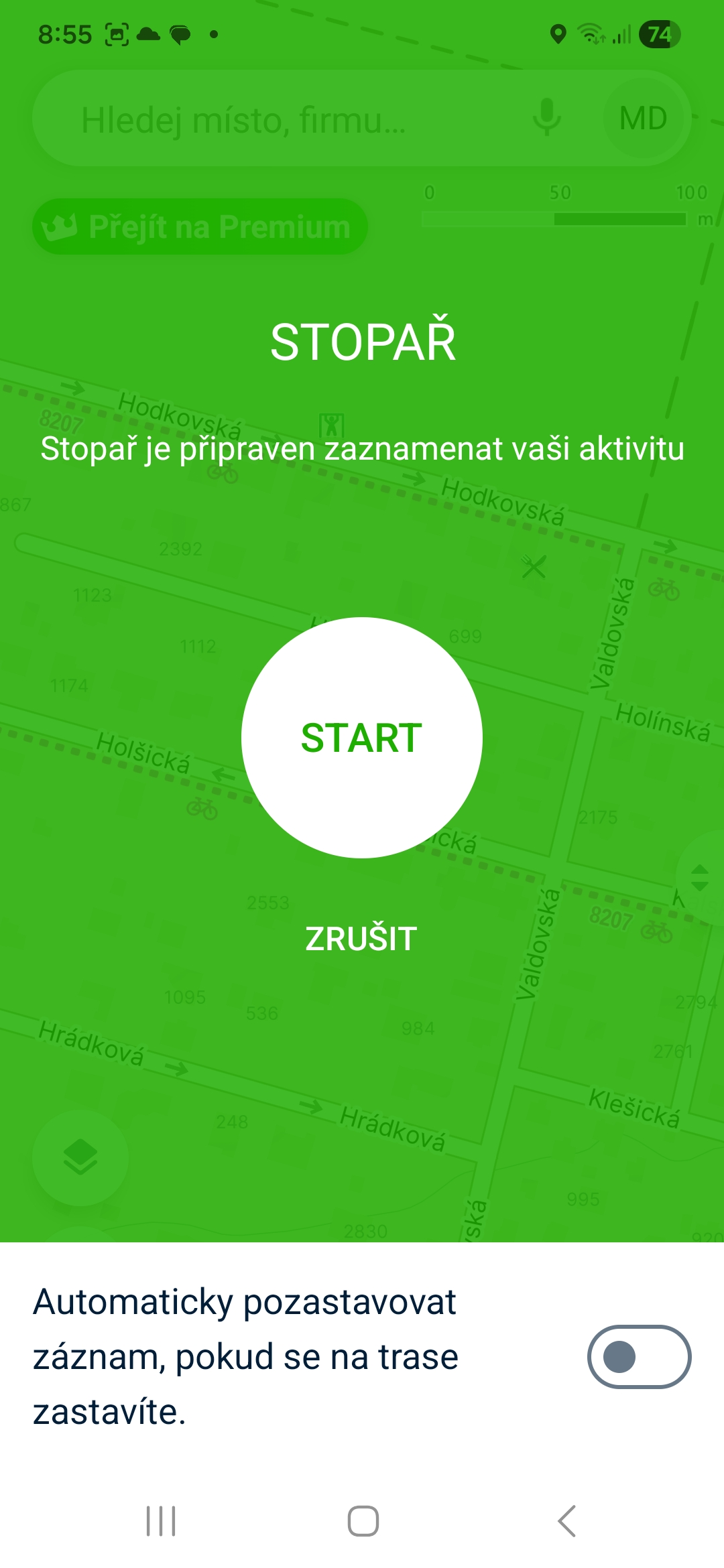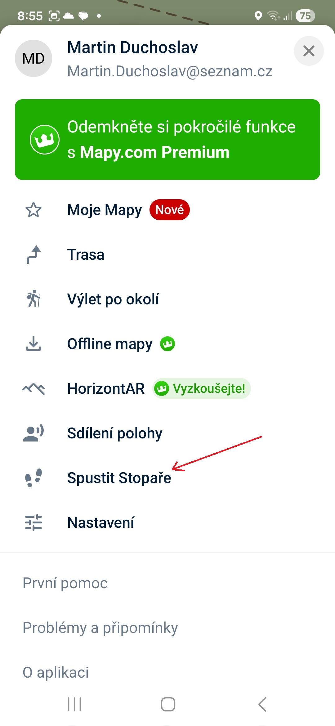 Chcete vědět, kolik jste toho dnes skutečně nachodili a kde přesně jste se zastavili na pivo? Funkce Stopař zaznamená vaši trasu na pozadí, zatímco máte telefon v kapse. Zapnete ji klepnutím na ikonu tří vodorovných čar, poté na „Spustit Stopaře“ a nakonec na „Start“.