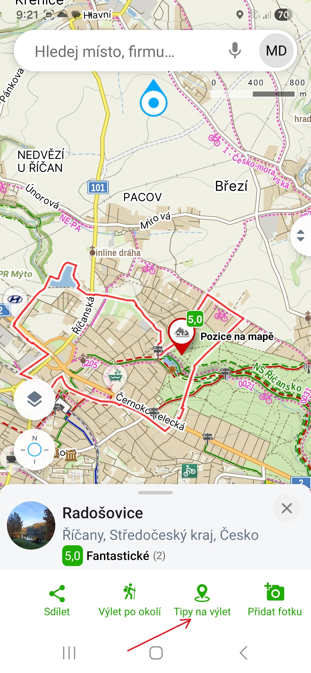 Chtěli byste se dozvědět o místě, kam jste právě došli, něco zajímavého? Žádný problém, stačí na mapě dlouze klepnout na dané místo a dole z možností vybrat Tipy na výlet, načež se vám zobrazí, co zajímavého v místě či jeho okolí najdete, ať už to je muzeum, zámek, tvrz, pevnost, vyhlídka, zvonička, zábavní park, významný hřbitov, či jiná turistická zajímavost.