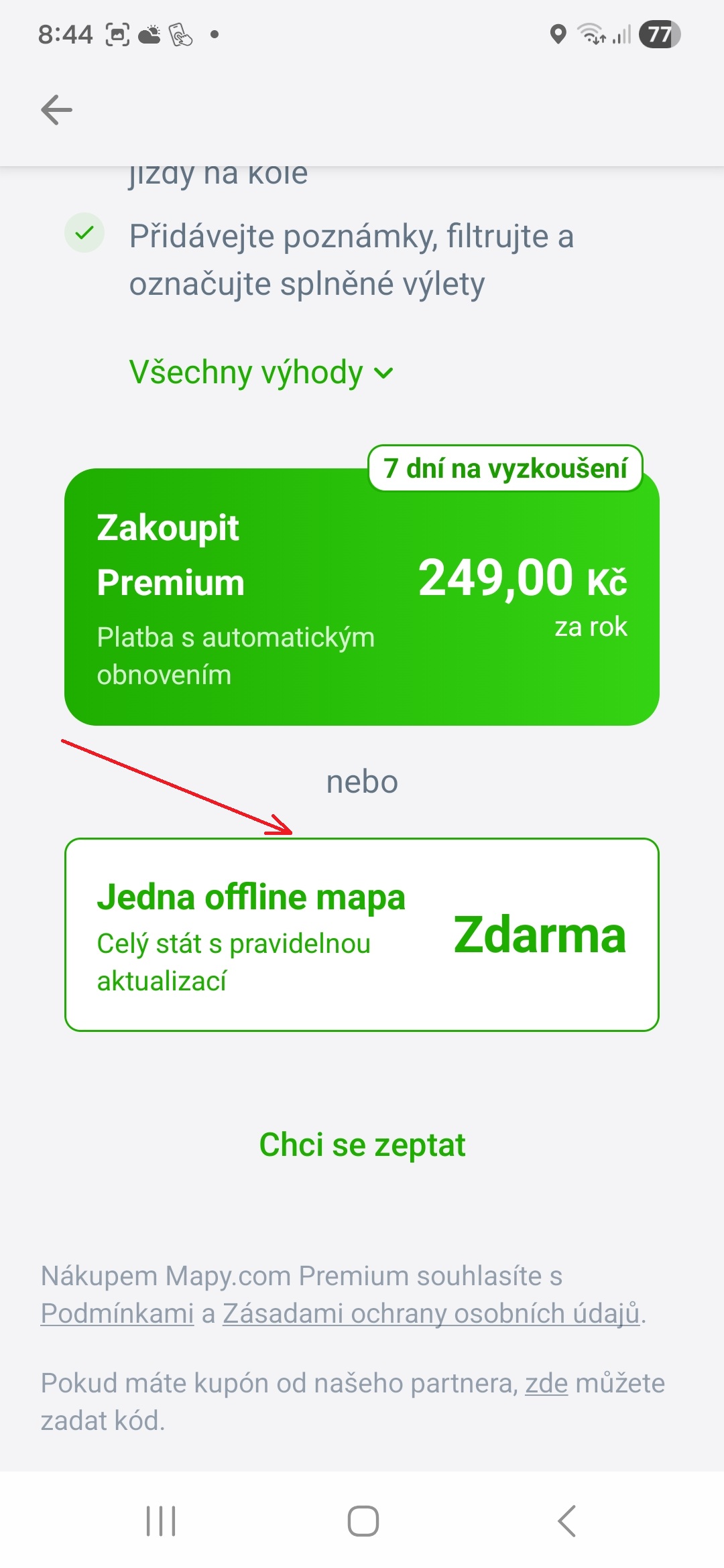 - Pokud si Mapy.com nepředplácíte, klepněte na „Jedna offline mapa“.